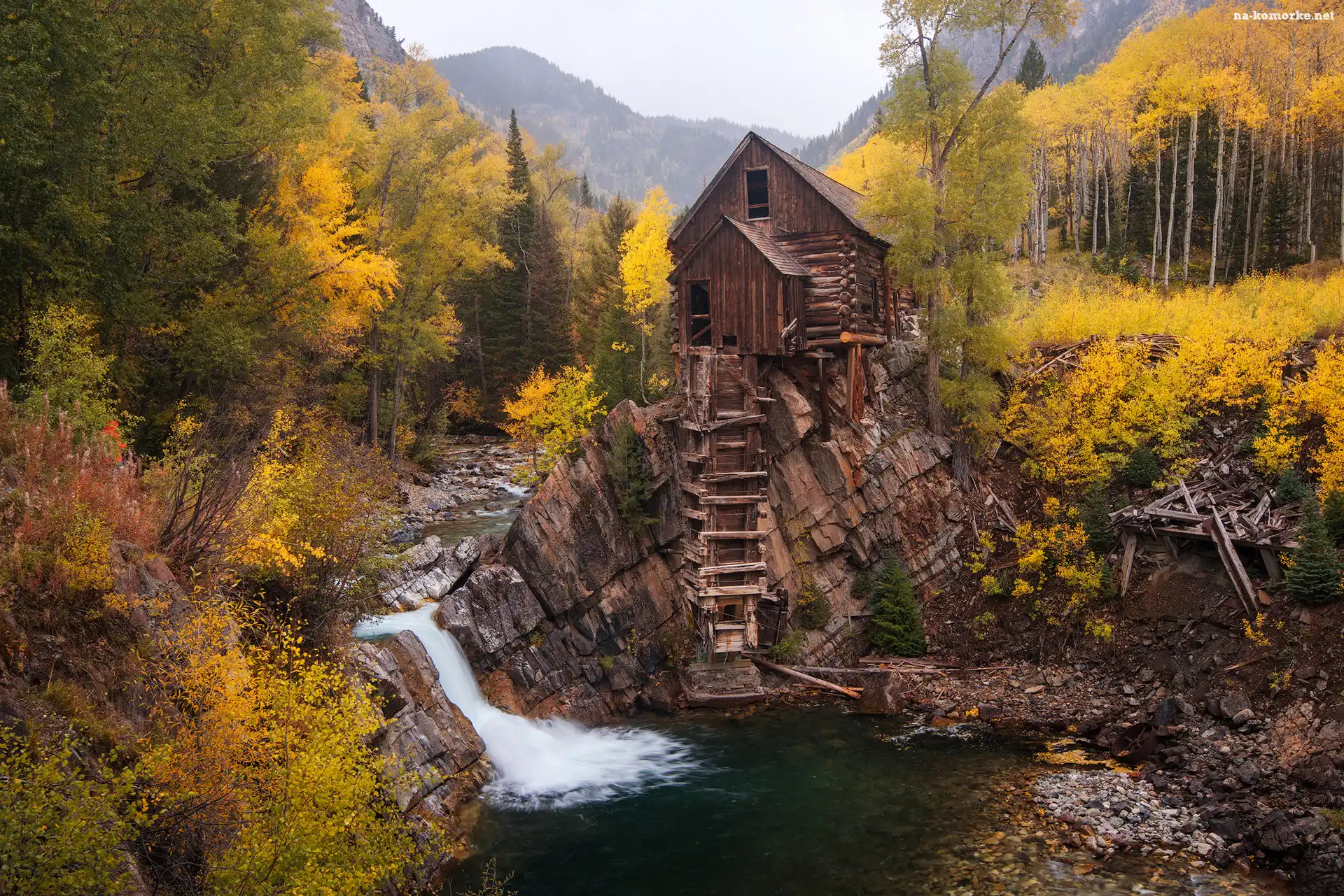 Jesień, Góry, Stany Zjednoczone, Drzewa, Las, Kryształowy Młyn, Młyn Crystal Mill, Rzeka Crystal River, Stan Kolorado na Komórkę |