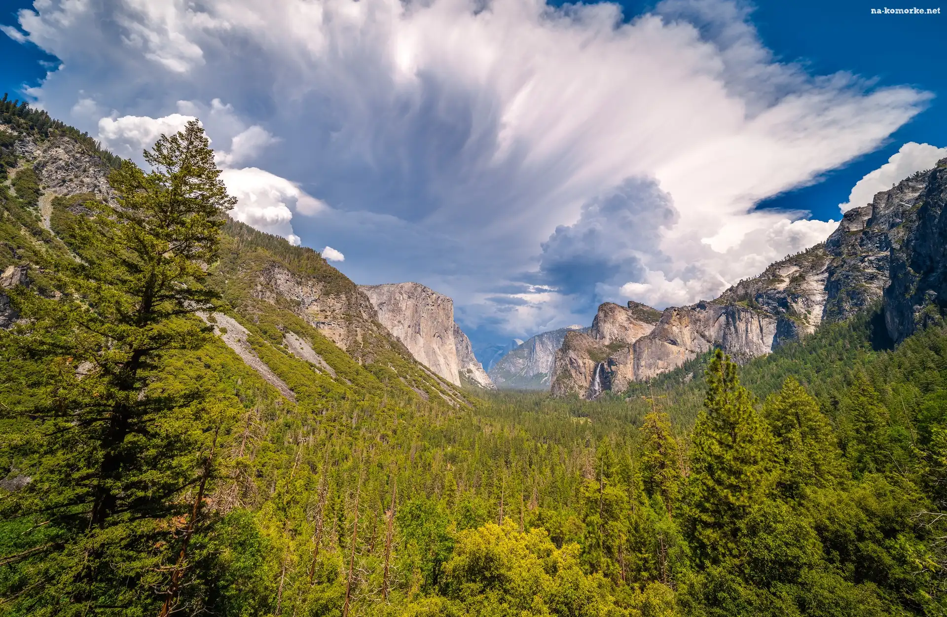 Góry, Niebo, Stany Zjednoczone, Las, Kalifornia, Park Narodowy Yosemite, Drzewa, Chmury, Dolina, Yosemite Valley na Komórkę |