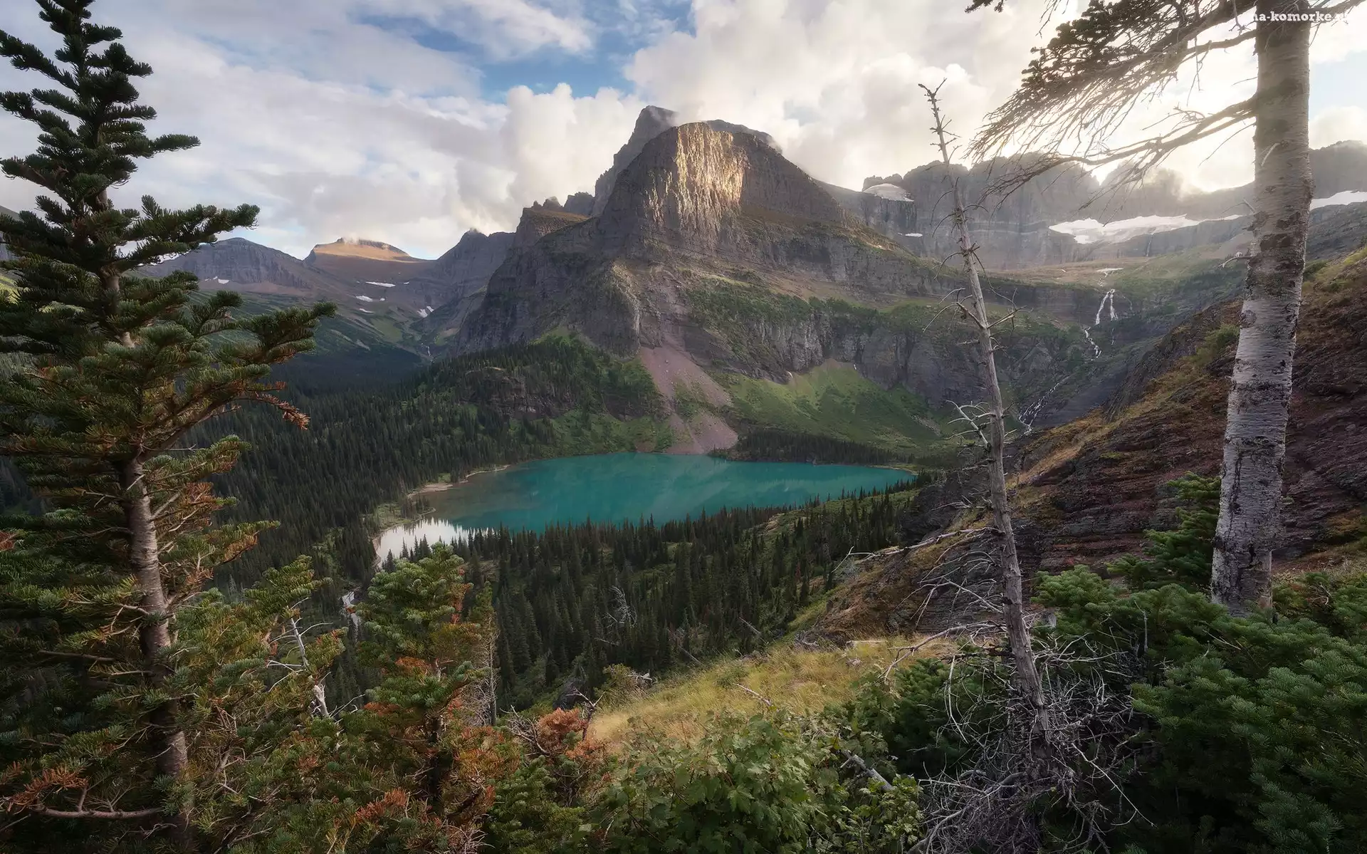Park Narodowy Glacier, Las, Stany Zjednoczone, Drzewa, Grinnell Lake, Jezioro, Góry, Chmury, Montana na Komórkę |