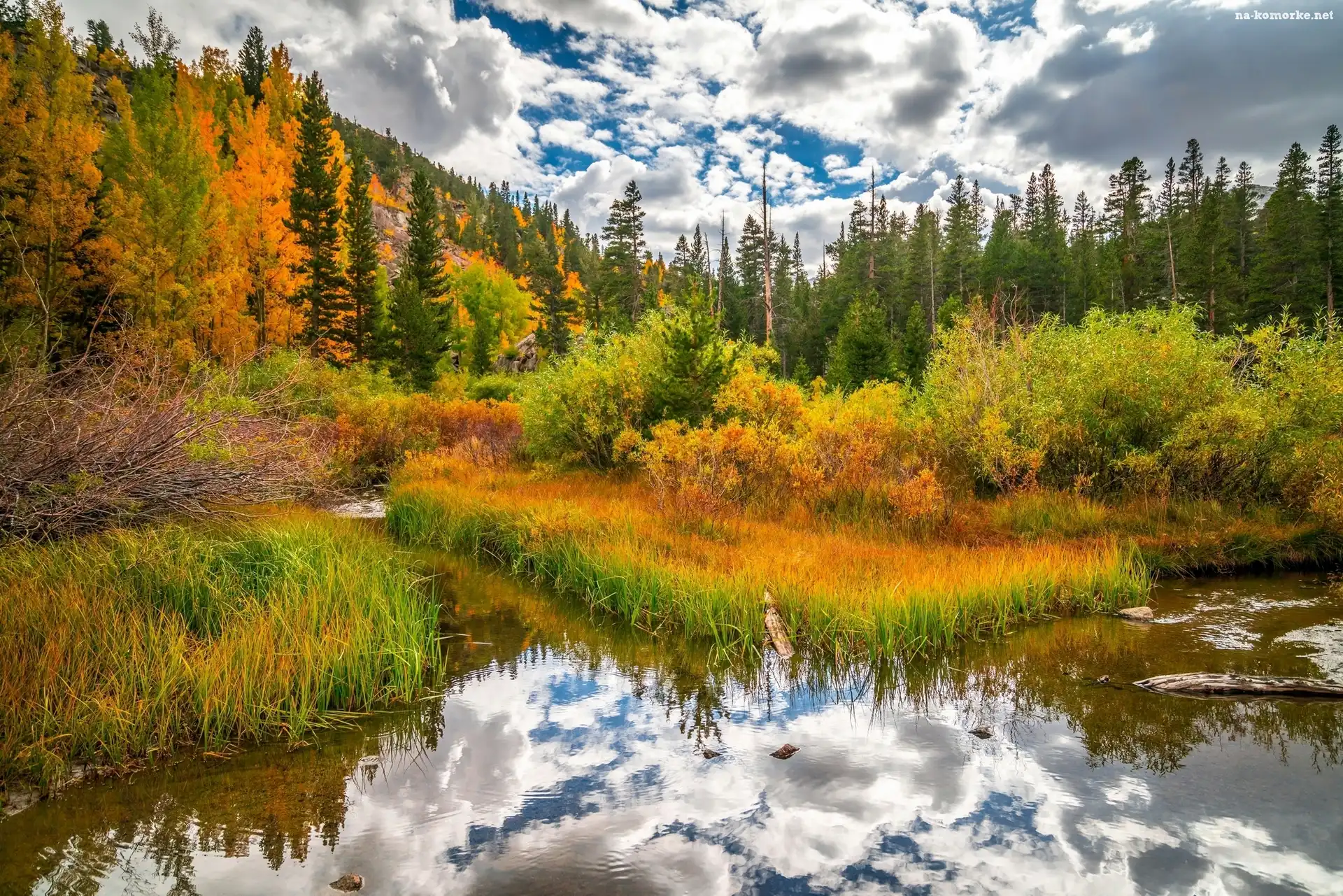 Las, Jesień, Jezioro, Trawa na Komórkę