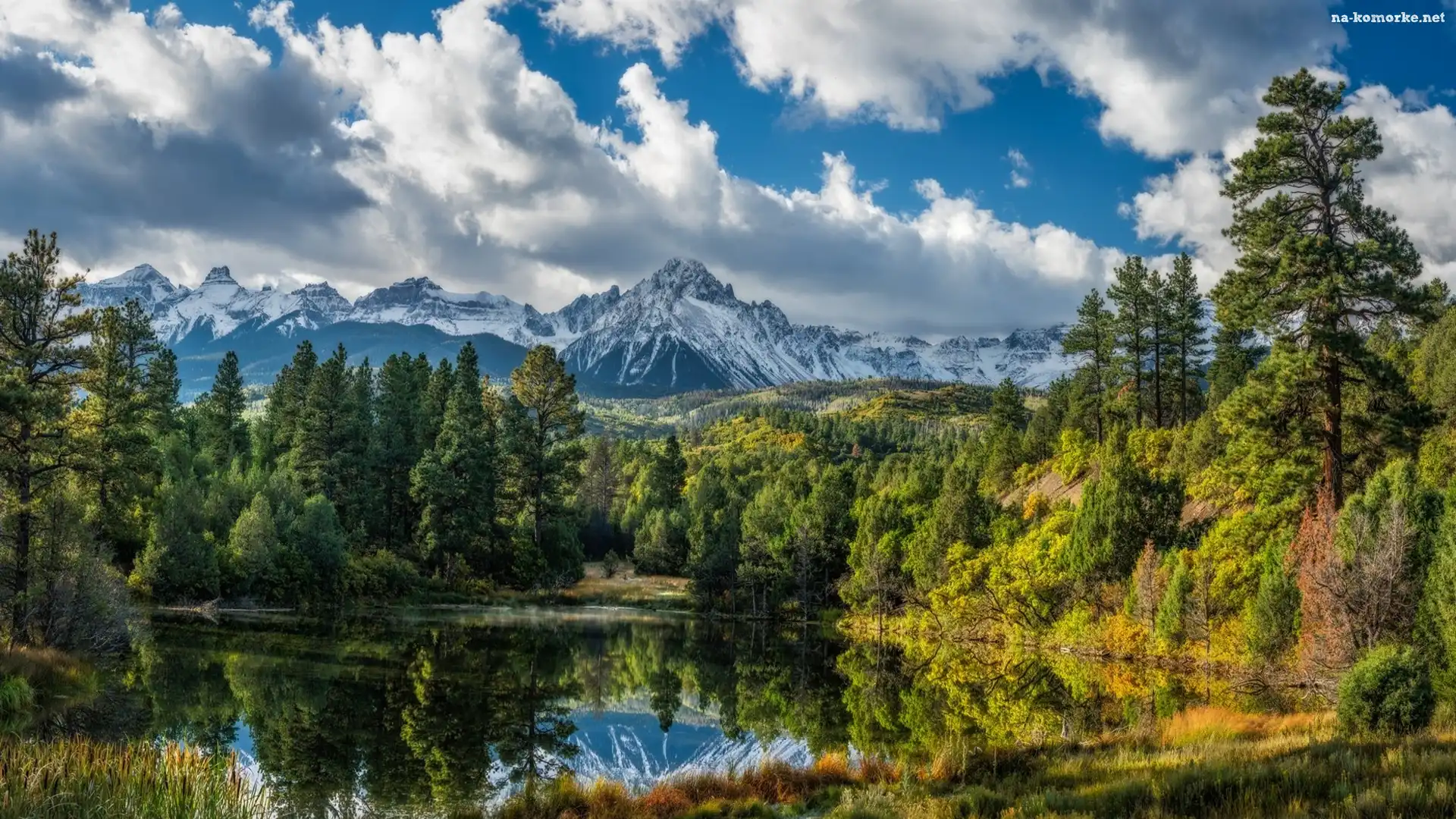 Las, Góry, Ośnieżone, Chmury, Jezioro, Drzewa na Komórkę