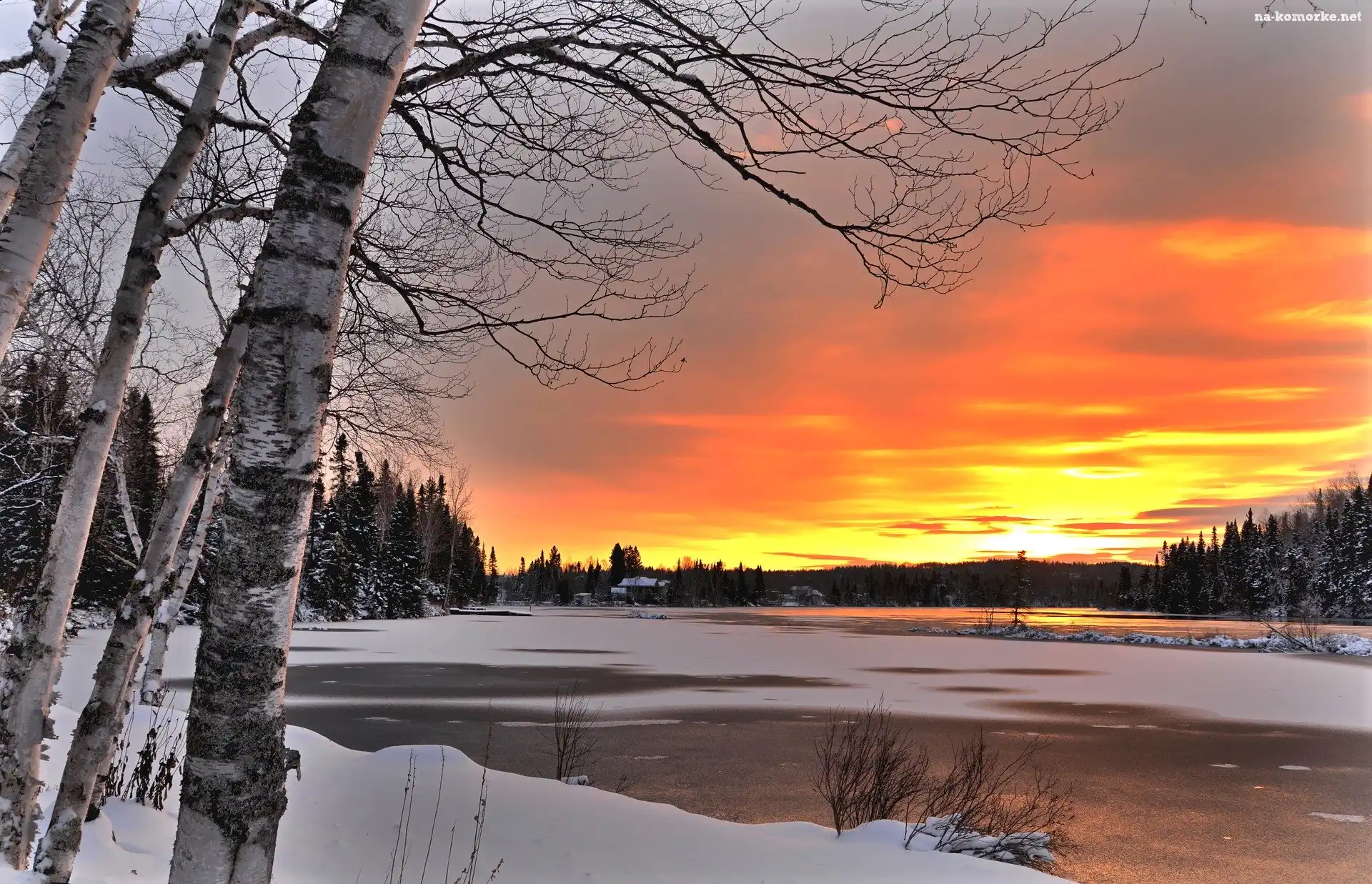 Las, Zima, Zachód słońca, Jezioro, Brzozy na Komórkę