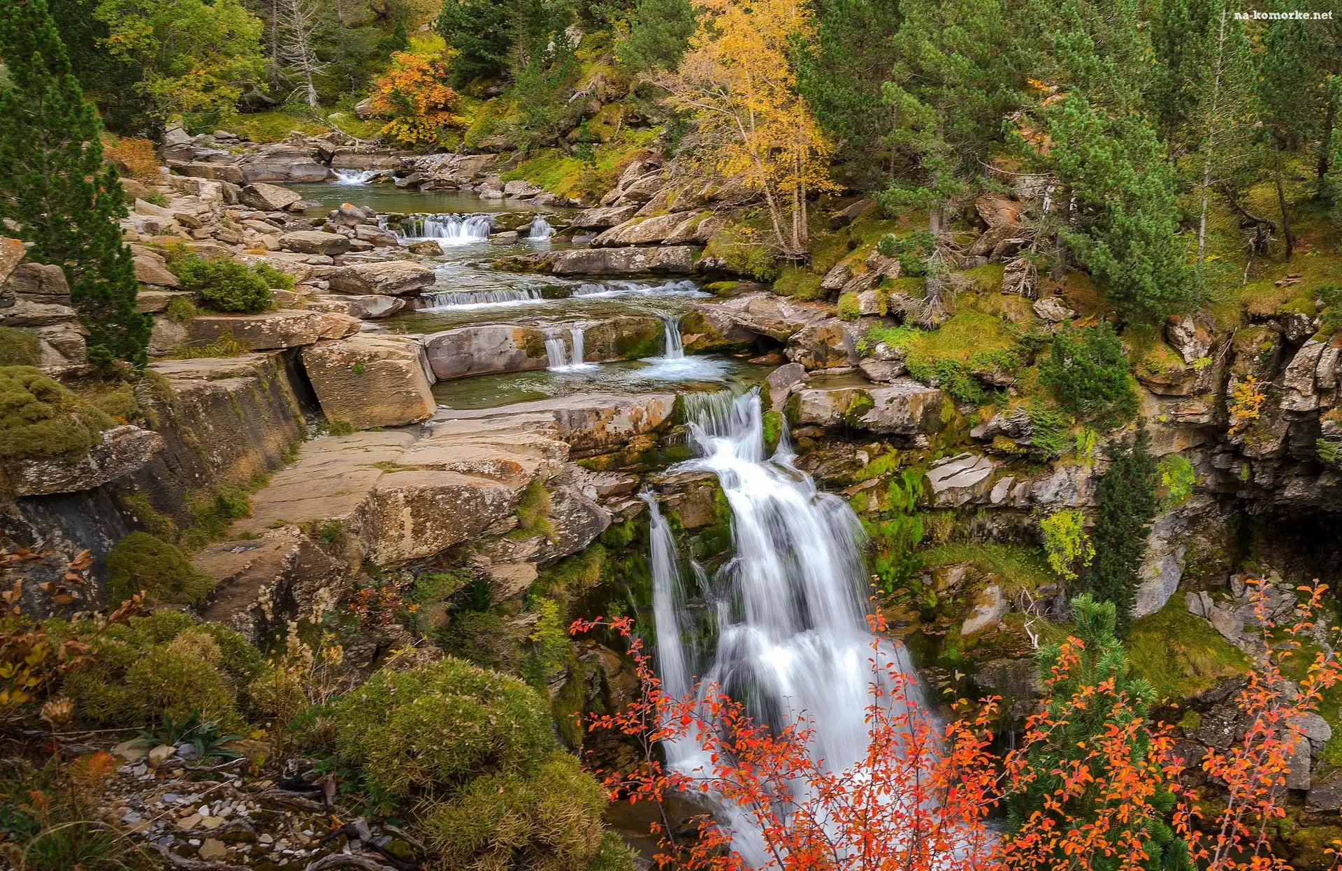 Las, Rzeka, Wodospad, Drzewa, Kamienie, Skały na Komórkę