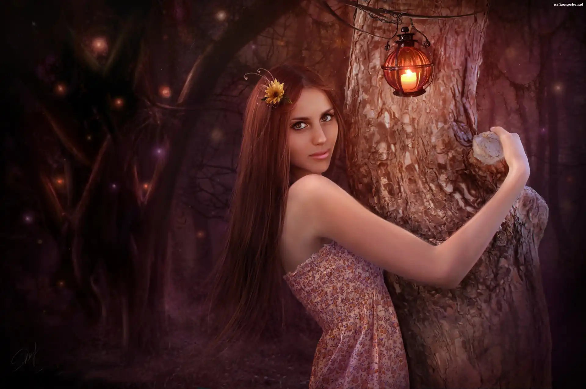 Las, Fantasy, Kobieta, Noc, Lampion, Drzewa na Komórkę