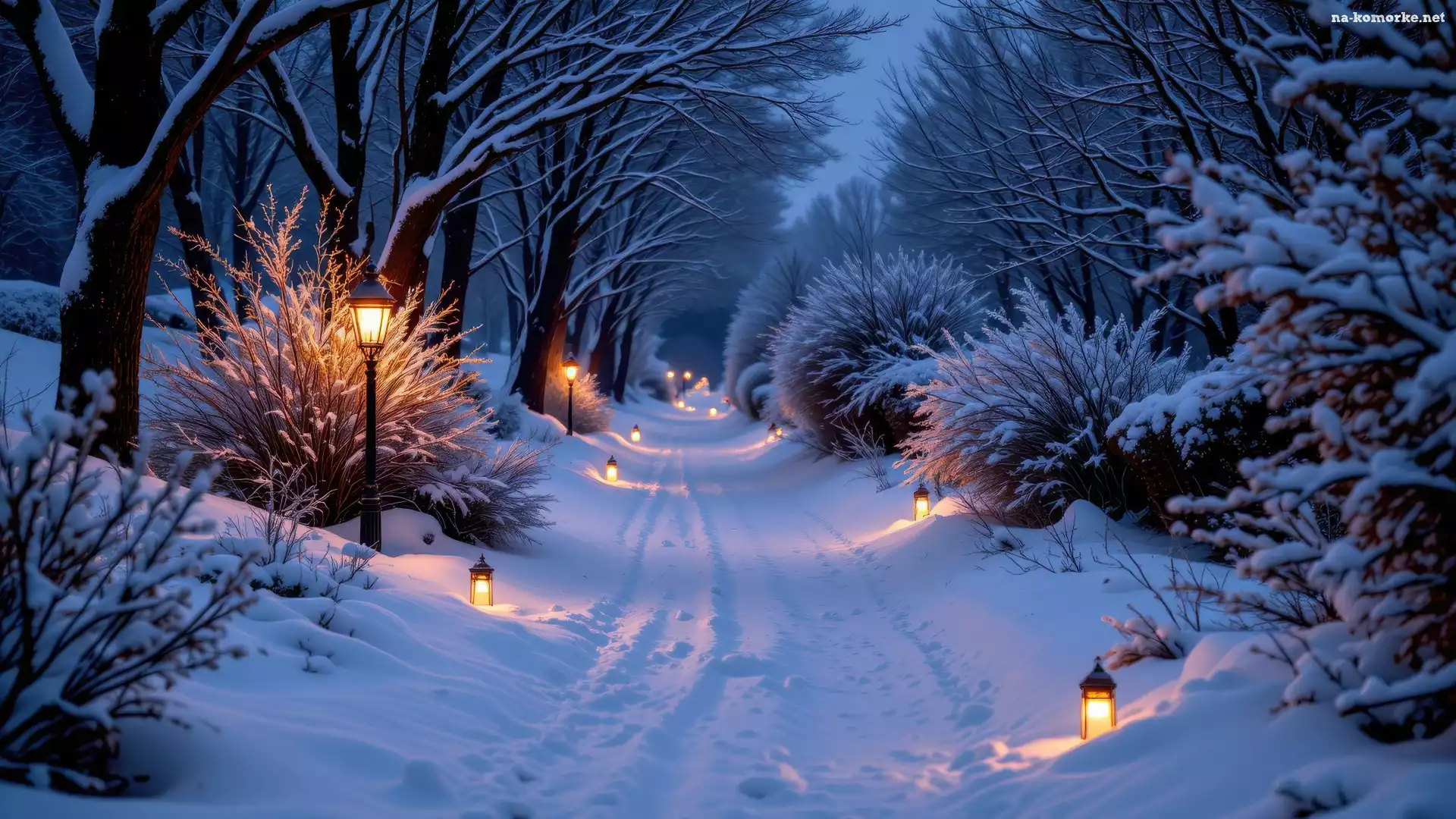 Las, Krzewy, Zaśnieżona, Drzewa, Droga, Zima, Lampiony, Ośnieżone, Latarnie, AI na Komórkę