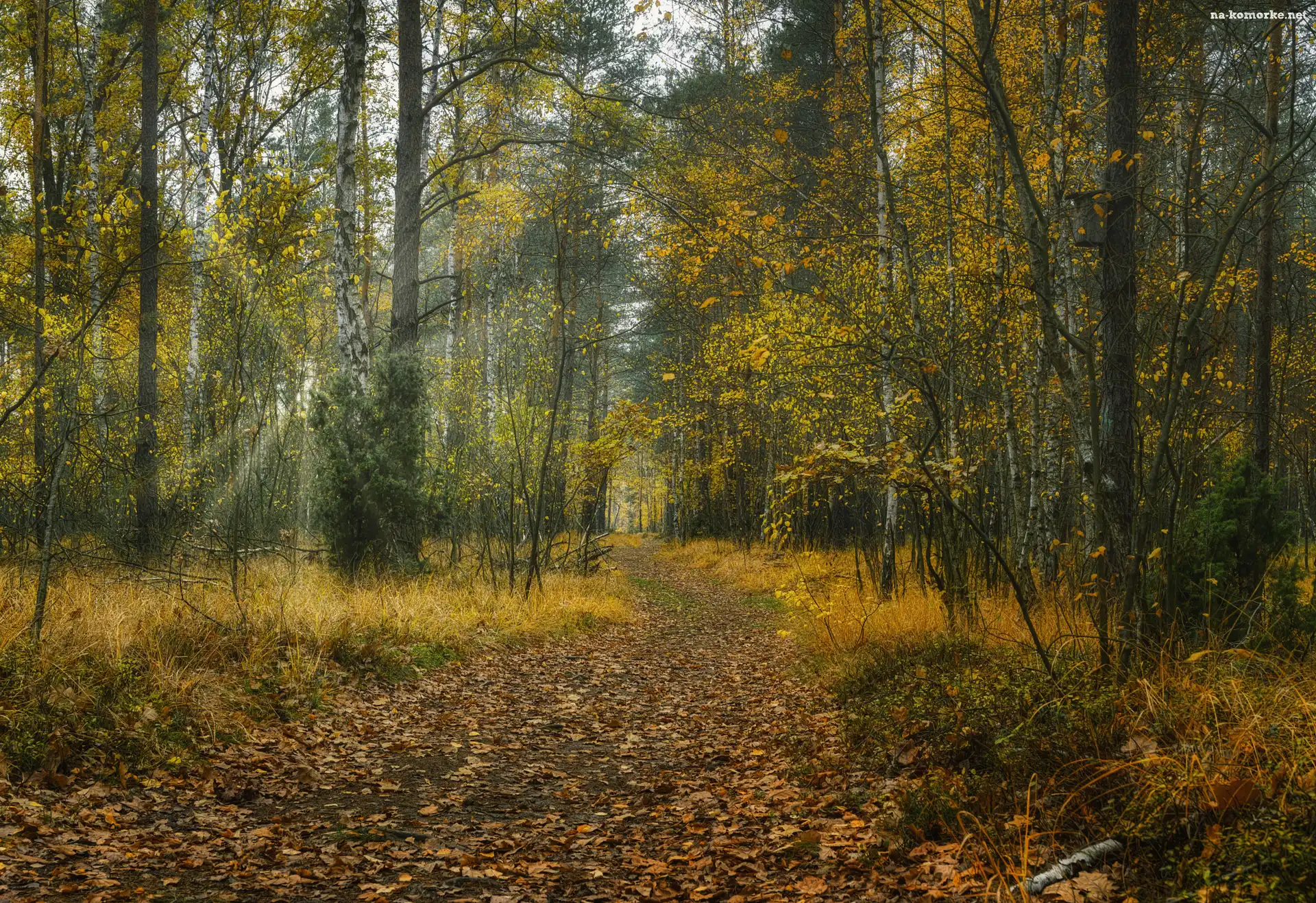 Liście, Las, Jesień, Promienie słońca, Opadłe, Ścieżka na Komórkę