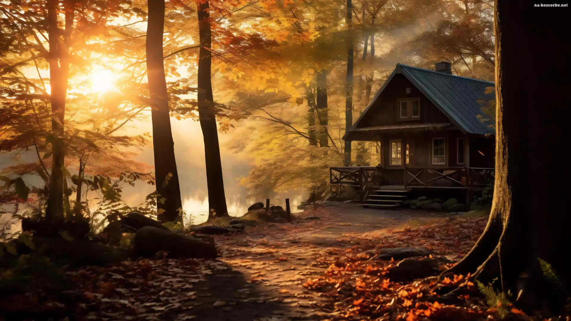 Drzewa, Mgła, Liście, Jesień, Staw, Słońce, Dom, Las na Komórkę