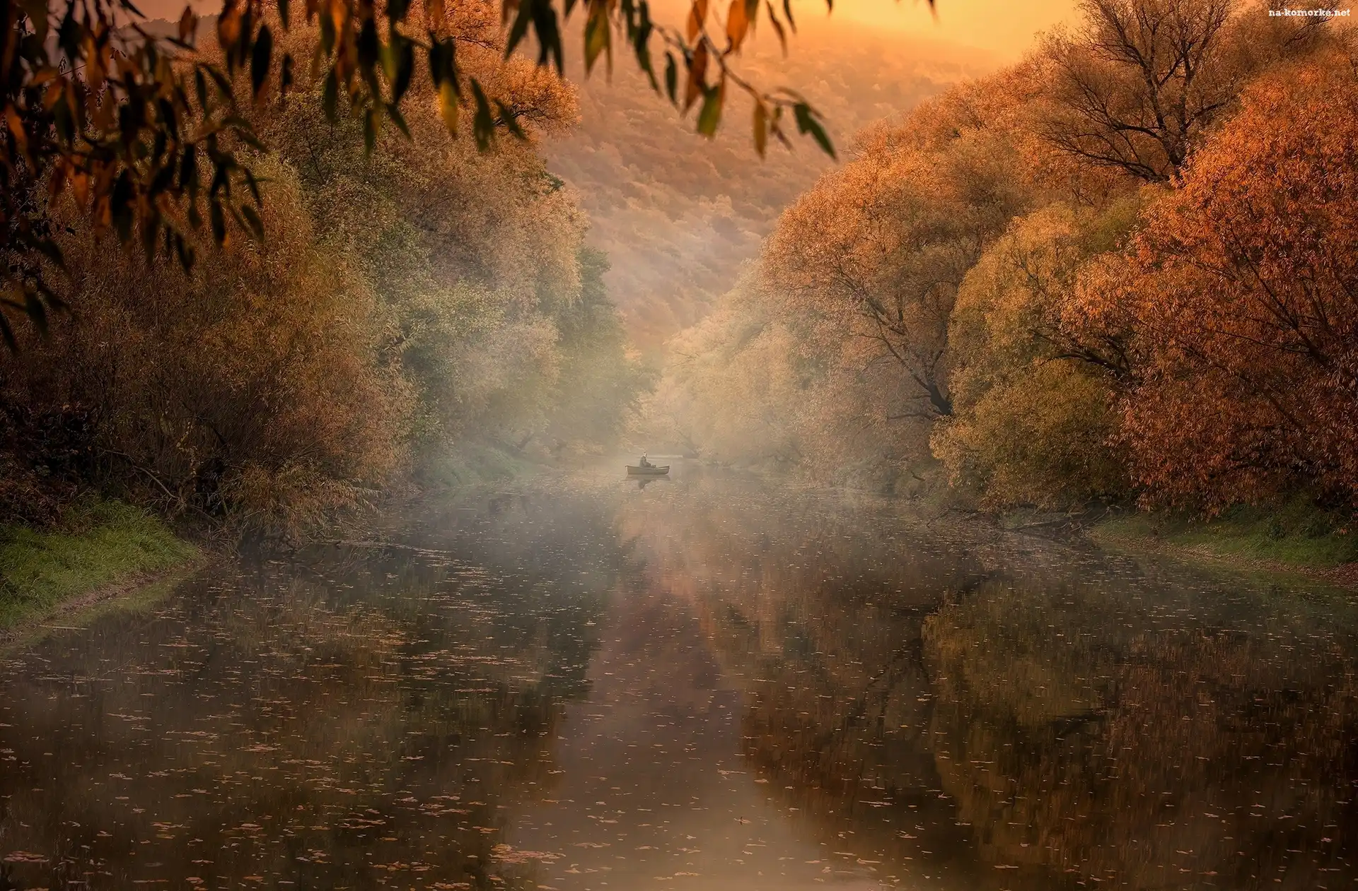 Las, Rzeka, Jesień, Postać, Mgła, Łódka na Komórkę