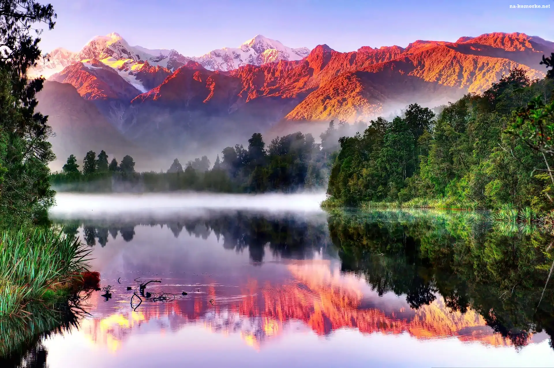 Mgła, Las, Góry, Nowa Zelandia, Jezioro, Odbicie na Komórkę
