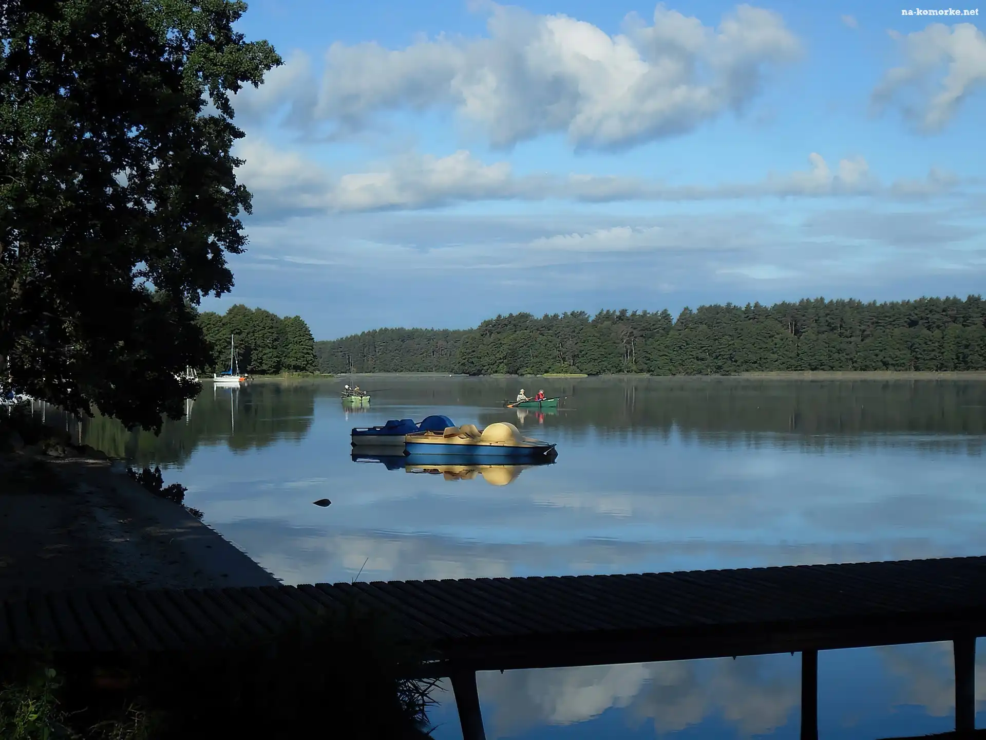 Las, Wędkarze, Jezioro, Chmury, Łódki, Drzewa na Komórkę