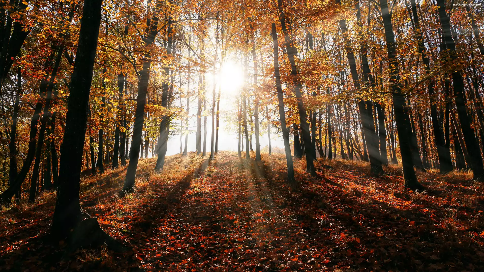 Opadłe, Las, Jesień, Promienie słońca, Drzewa, Liście na Komórkę