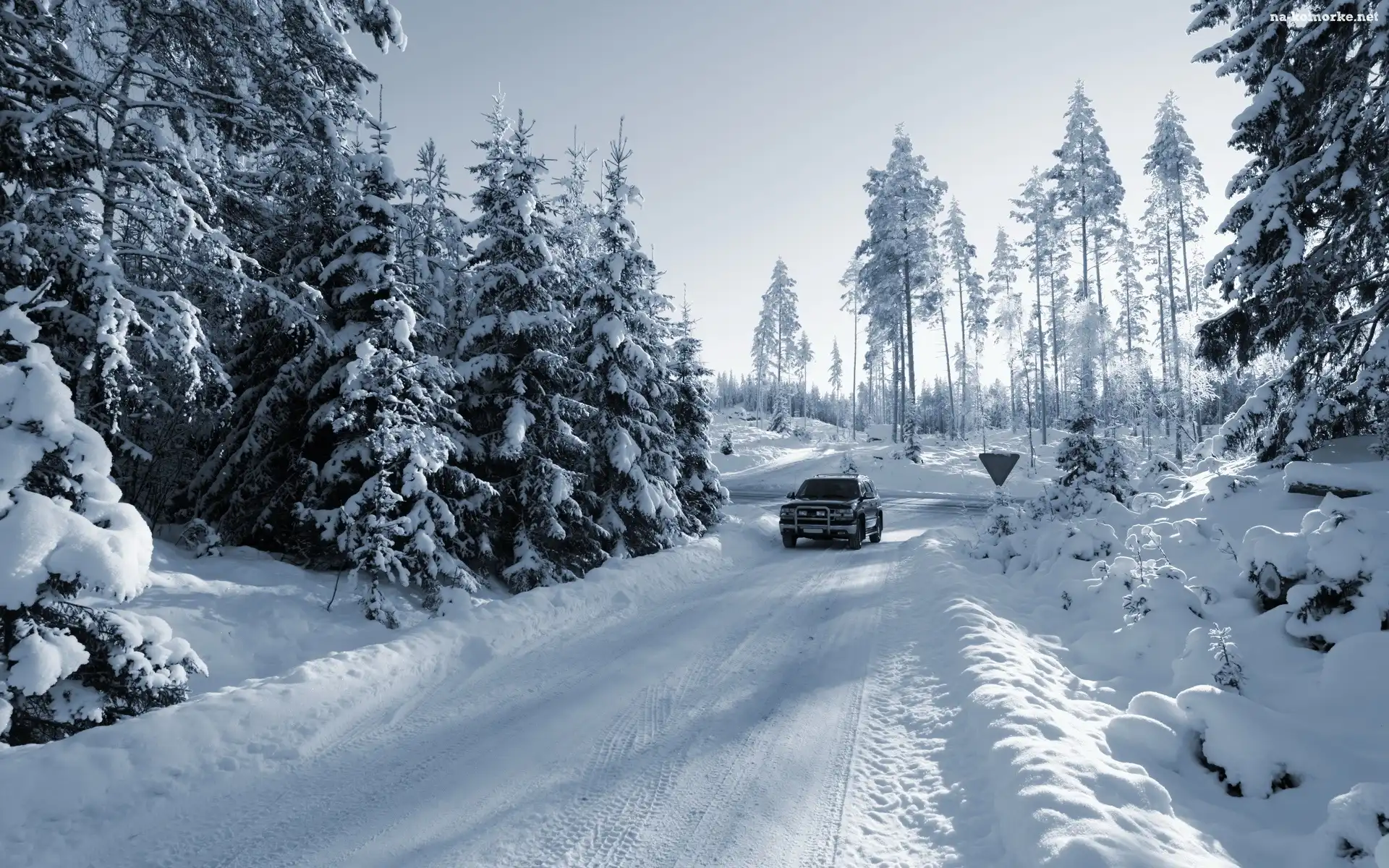 Las, Droga, Auto, Ośnieżone, Drzewa na Komórkę