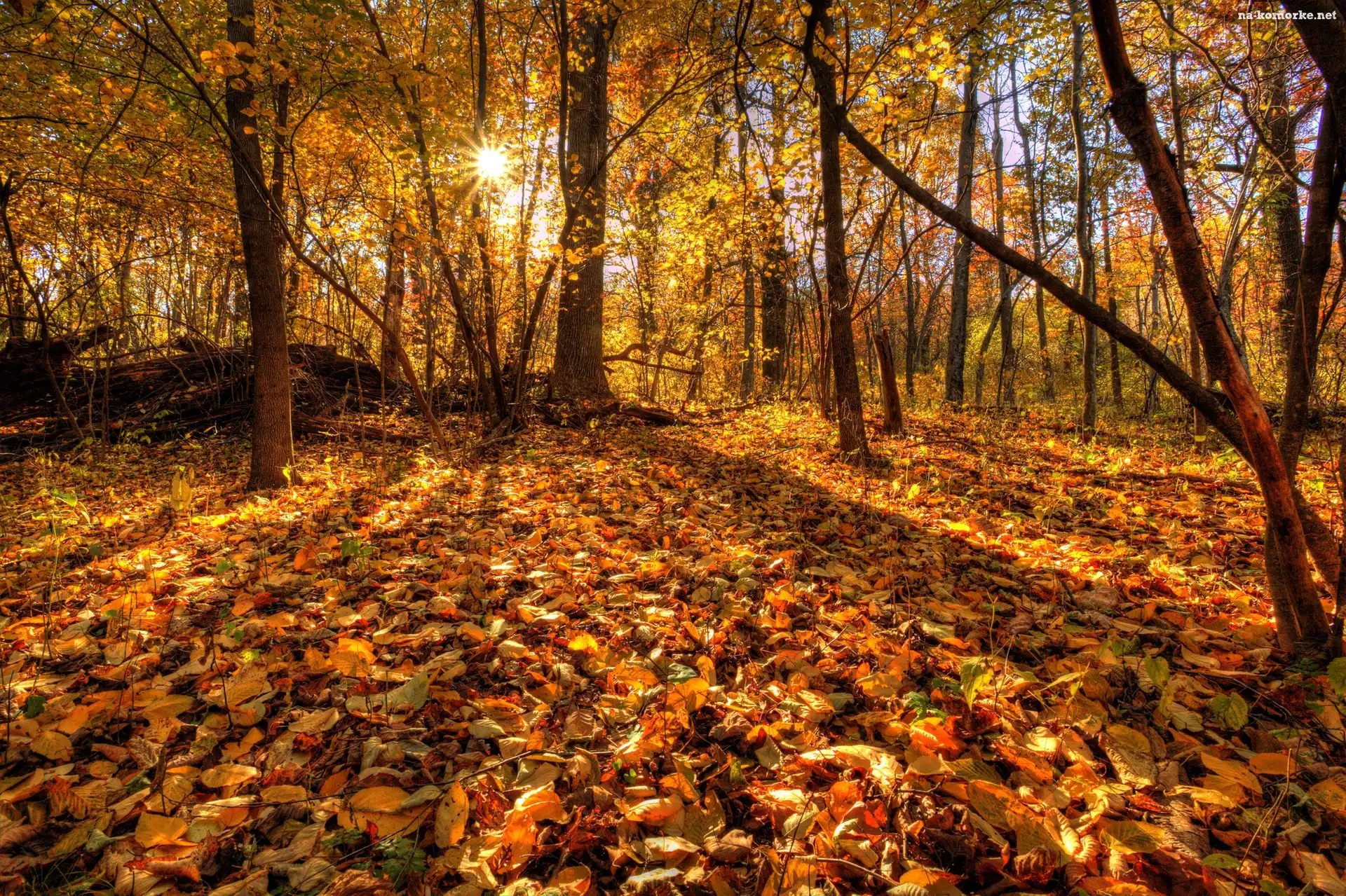 Las, Jesień, Liście, Promienie Słońca na Komórkę