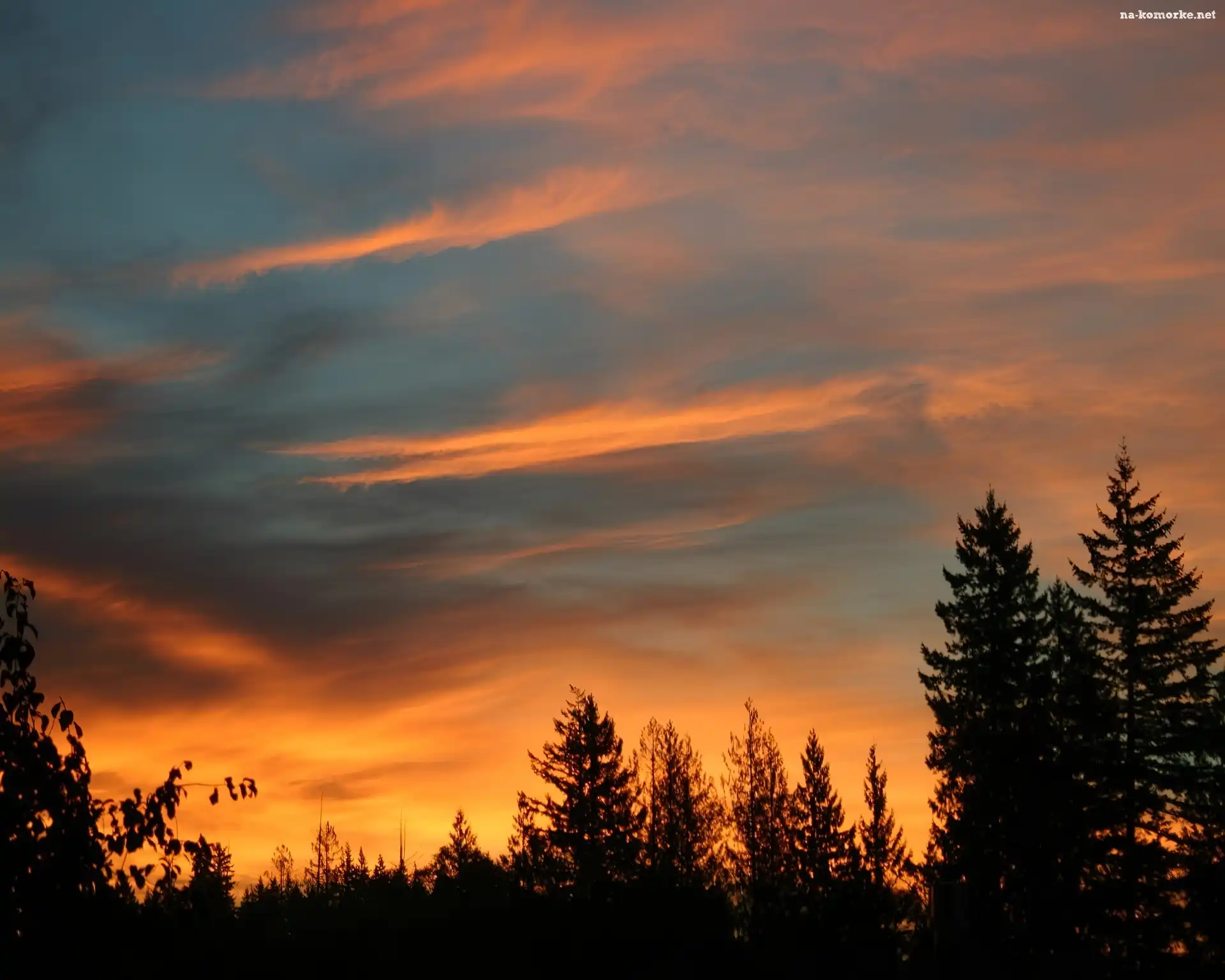 Las, Zachód, Słońca, Promienie, Chmury na Komórkę