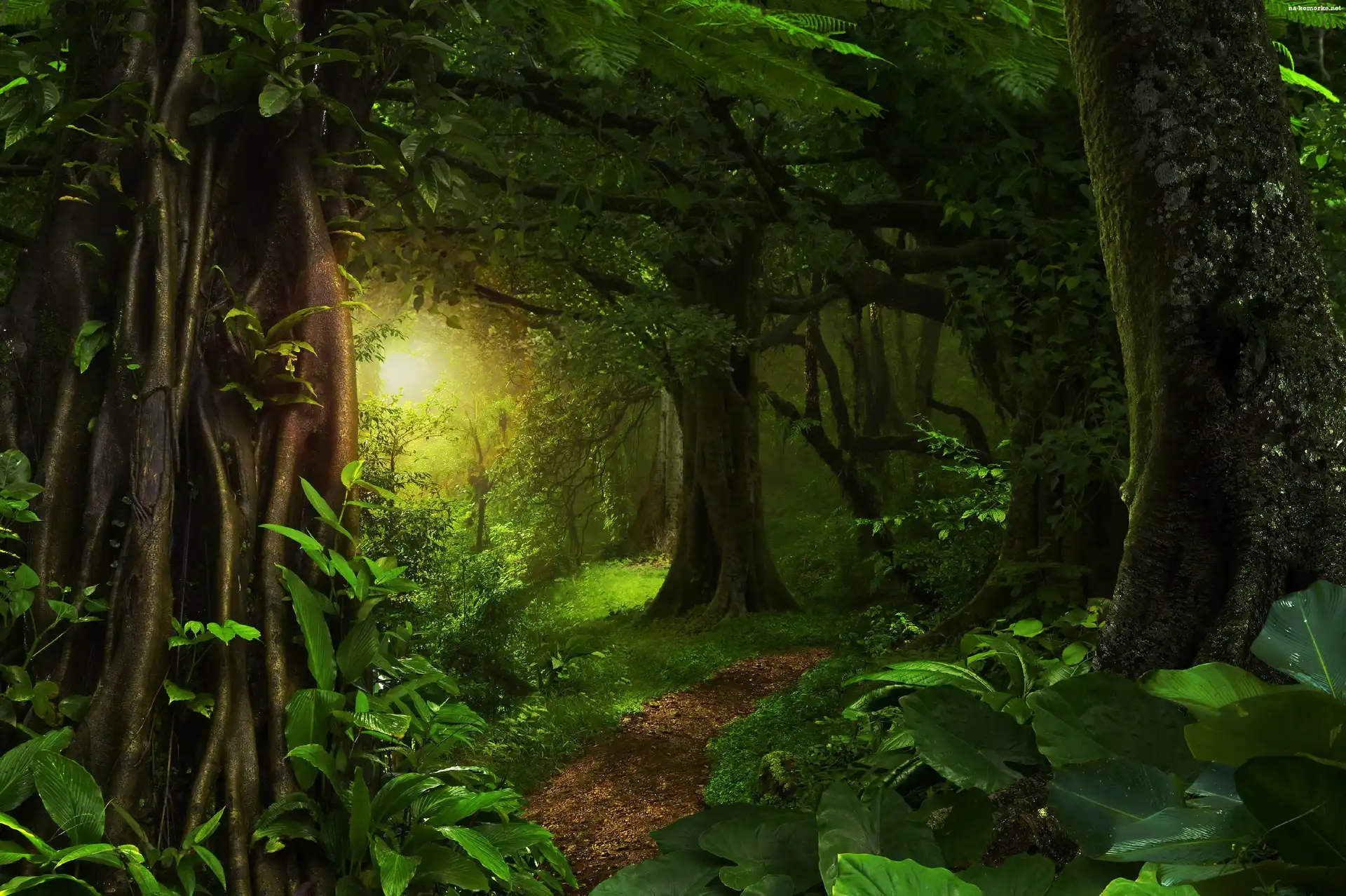 Las, Dżungla, Ścieżka, Drzewa, Przebijające światło na Komórkę