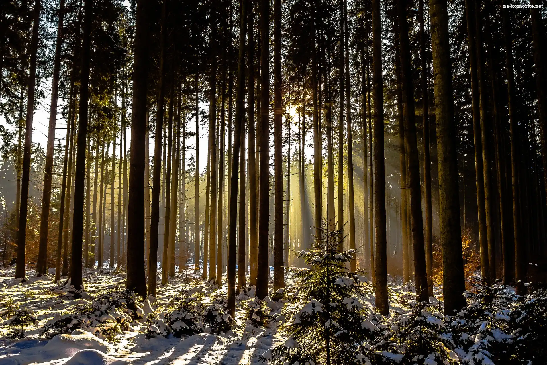 Las, Zima, Drzewa, Przebijające światło na Komórkę