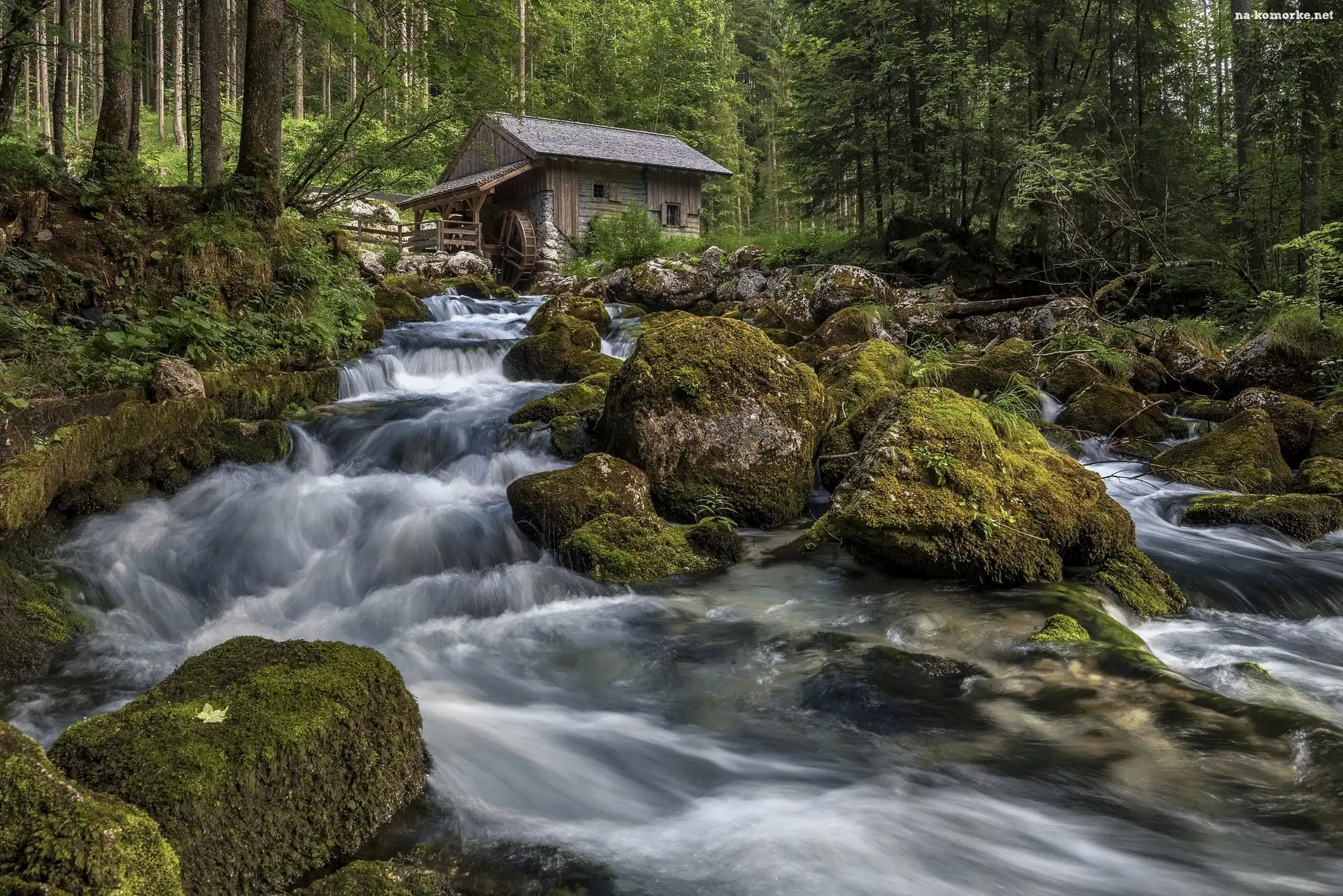 Rzeka, Las, Młyn wodny, Kamienie, Drzewa, Omszałe na Komórkę
