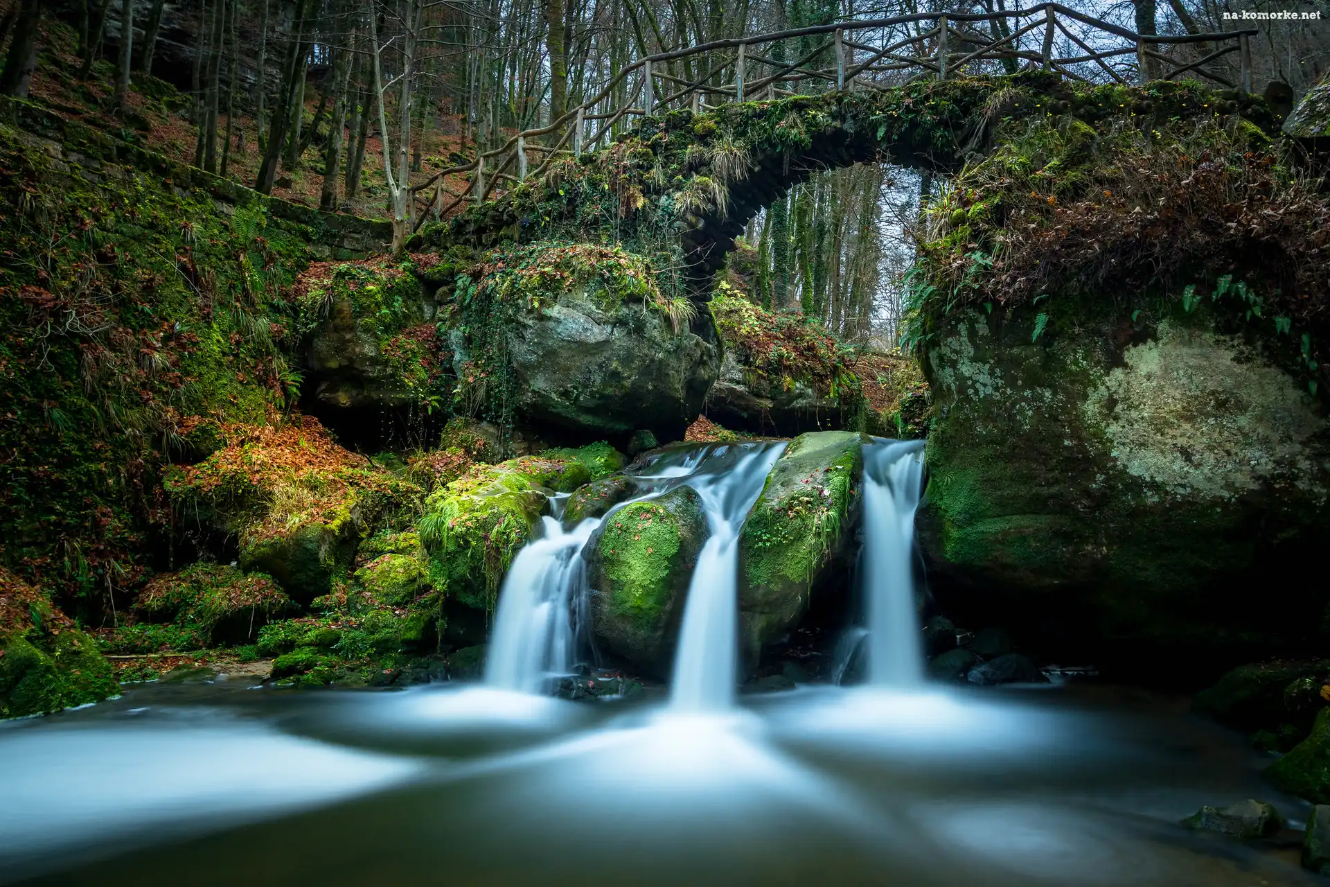 Wodospad Schiessentumpel, Las, Skały, Rzeka, Luksemburg, Drzewa, Mullerthal, Most, Mała Szwajcaria na Komórkę |