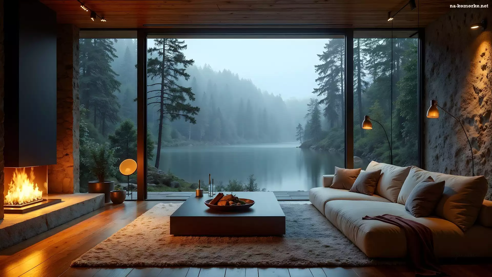 Widok, Rzeka, Salon, Las, Kanapa, Okno, Kominek na Komórkę