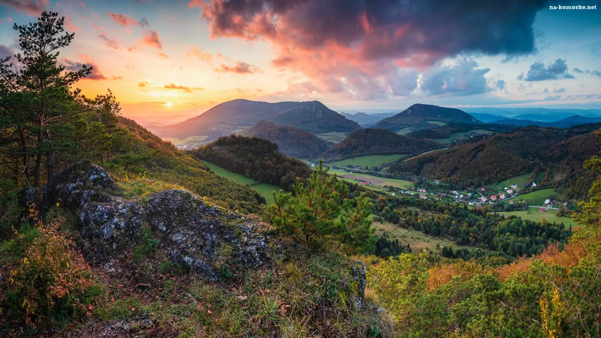 Dolina, Zachód słońca, Góry, Chmury, Drzewa, Domy, Las na Komórkę