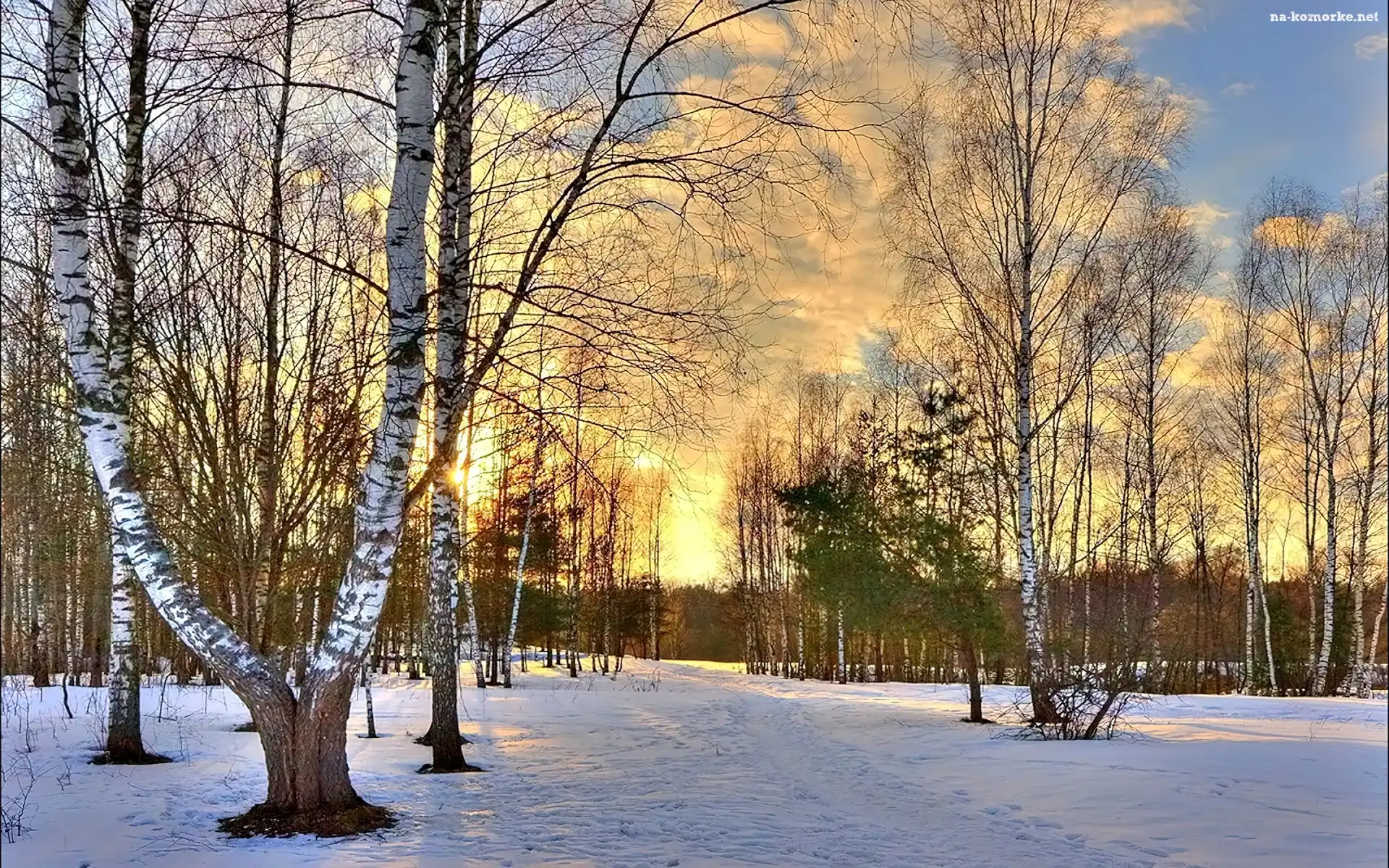 Las, Drzewa, Zachód Słońca, Śnieg na Komórkę