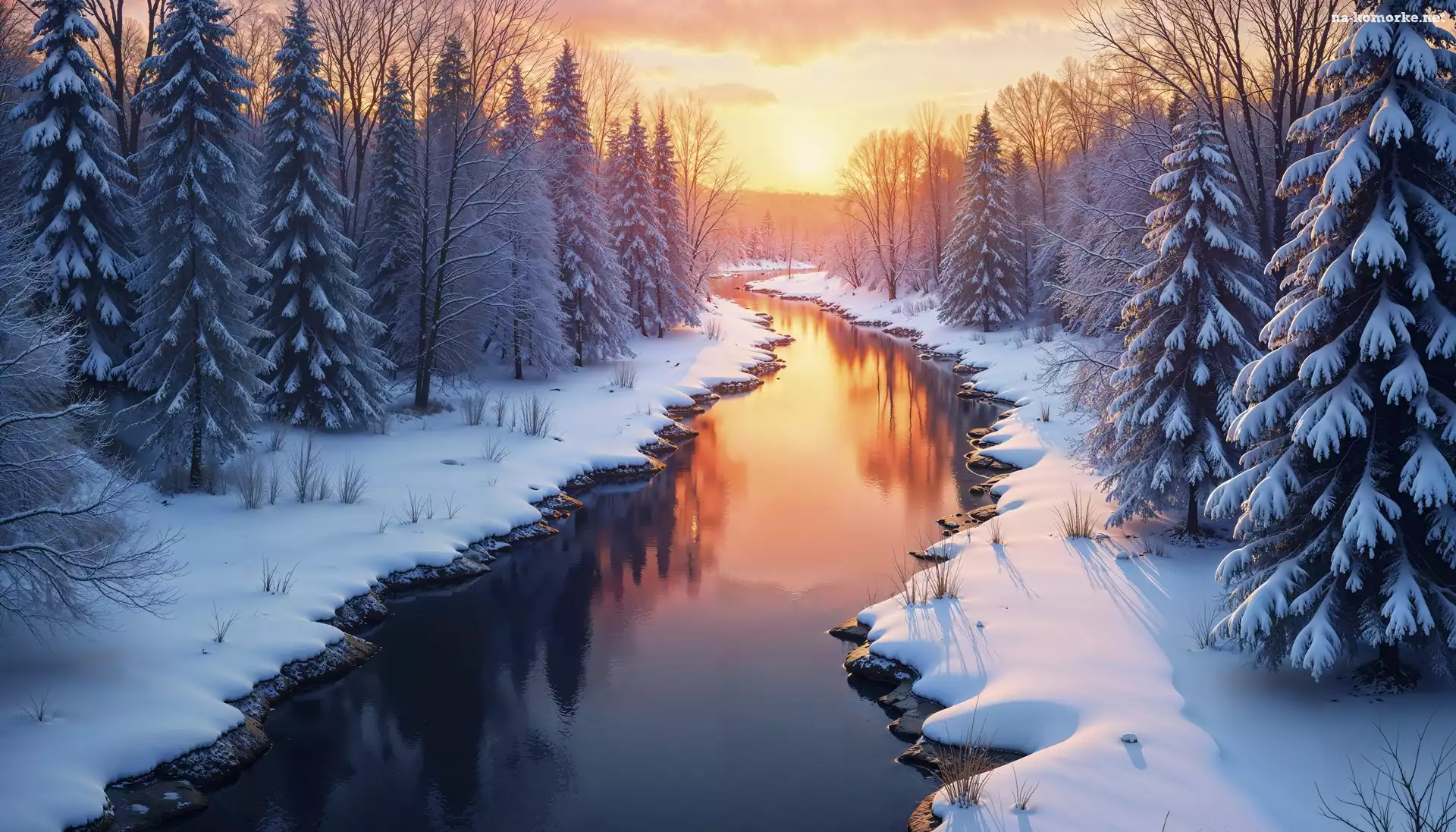 Rzeka, Zachód słońca, Zima, Grafika, Ośnieżone, Drzewa, Las na Komórkę