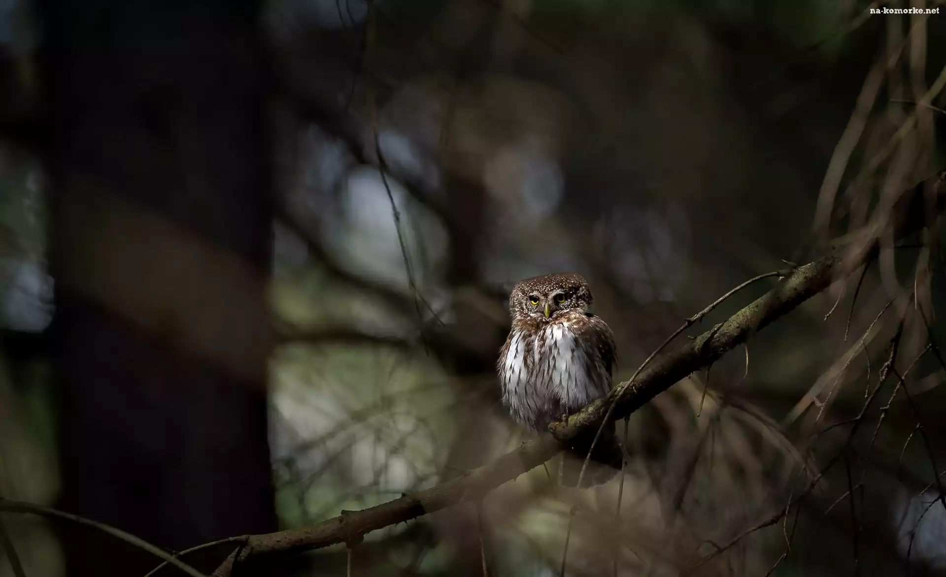 Gałęzie, Las, Sowa, Sóweczka zwyczajna na Komórkę