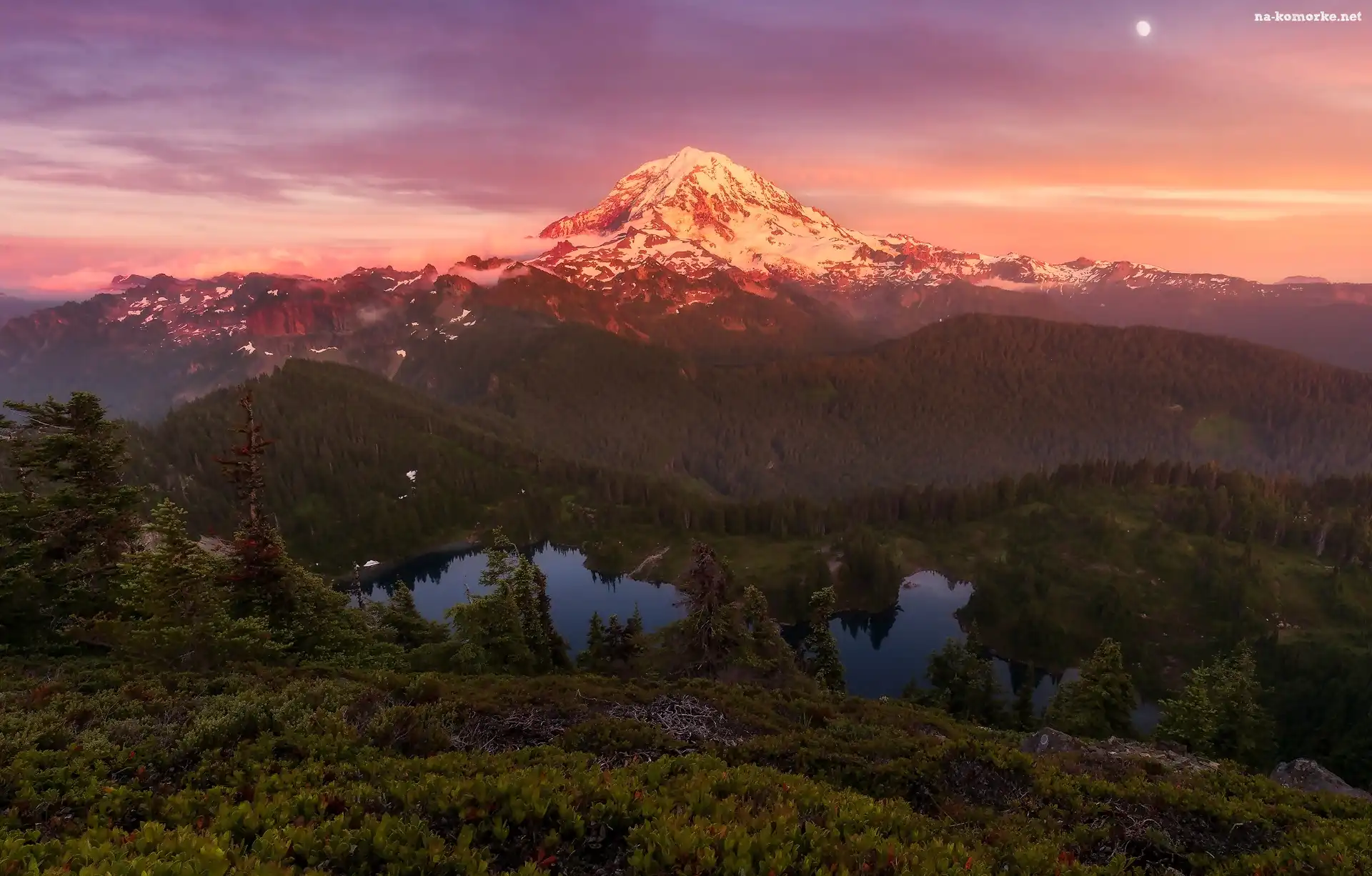 Las, Góry, Księżyc, Jezioro, Stany Zjednoczone, Góra Tolmie Peak, Stan Waszyngton, Zachód słońca, Park Narodowy Mount Rainier na Komórkę |