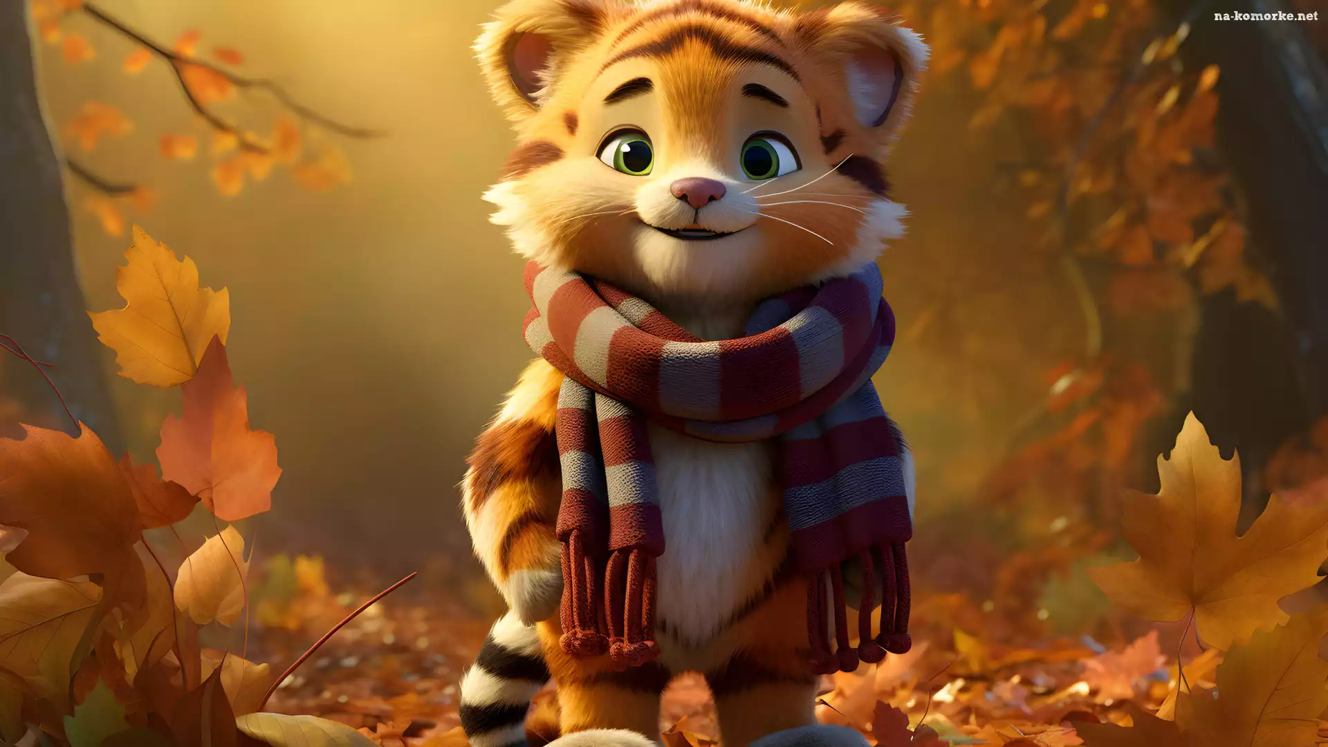 Drzewa, Liście, Uśmiech, Jesień, Szalik, Grafika, Tygrys, Las na Komórkę
