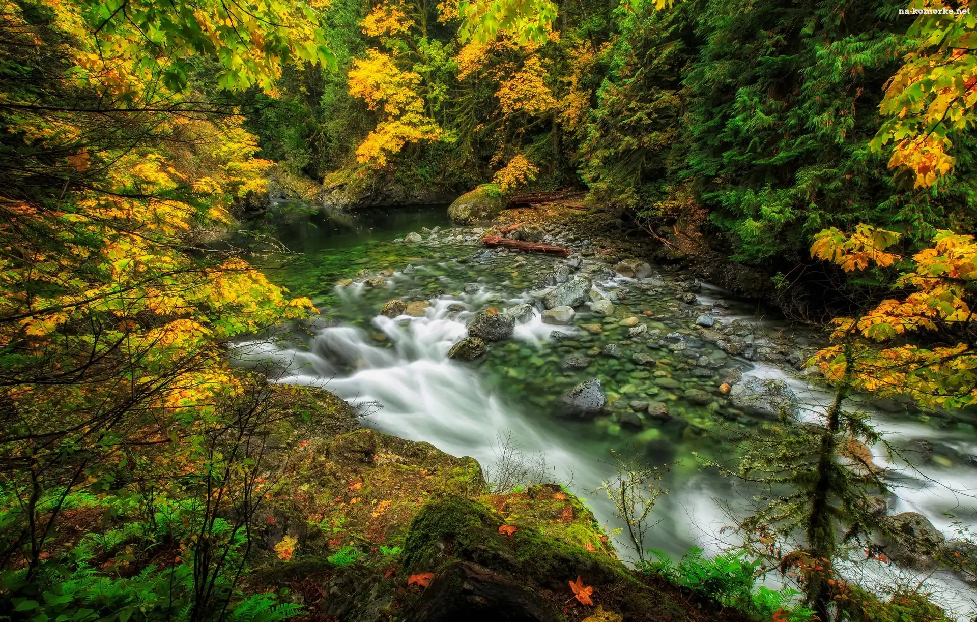 Kamienie, Stan Waszyngton, Stany Zjednoczone, Jesień, Rzeka Snoqualmie, Las na Komórkę
