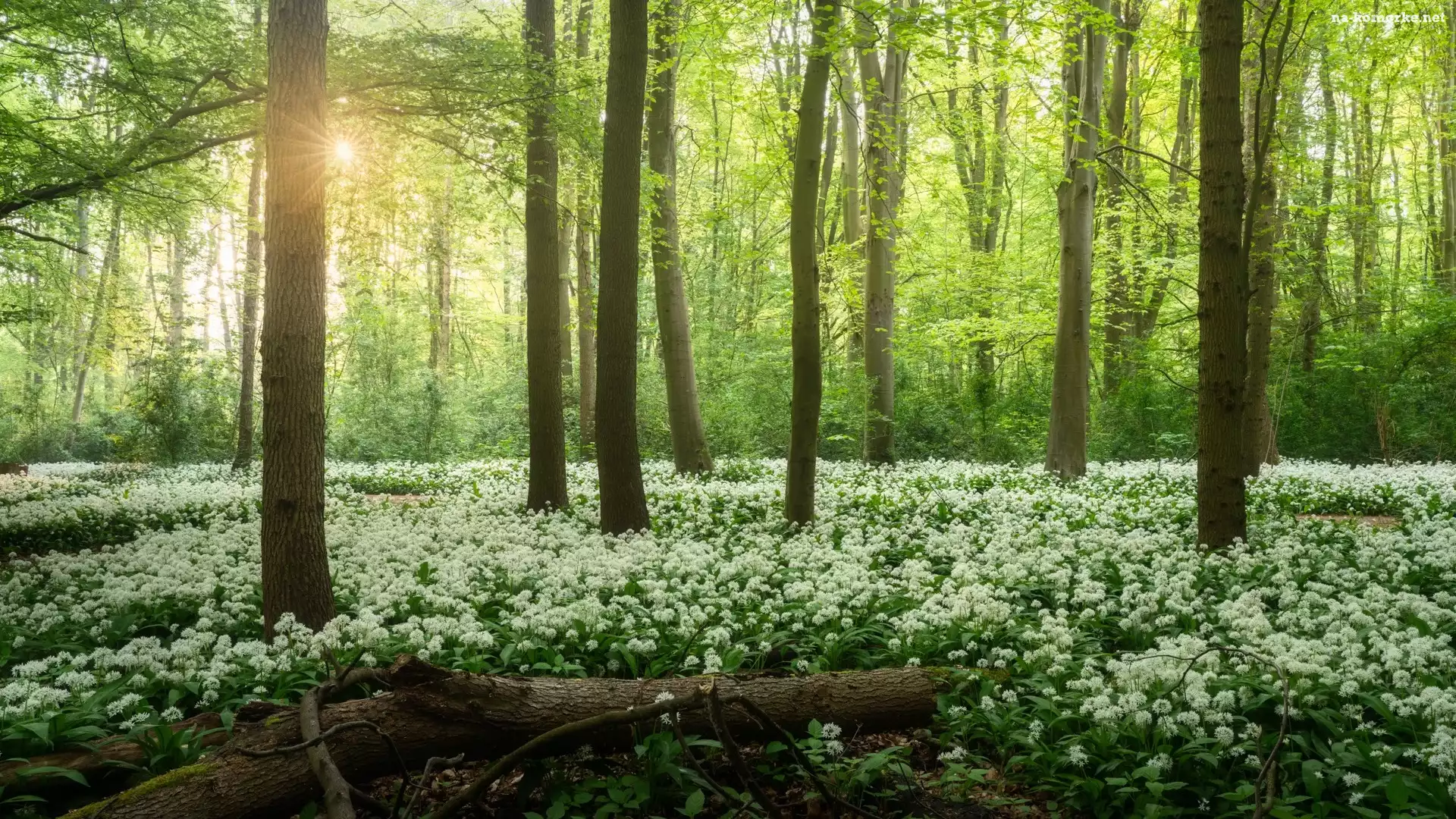 Wiosna, Las, Kwiaty, Czosnek niedźwiedzi, Promienie słońca na Komórkę