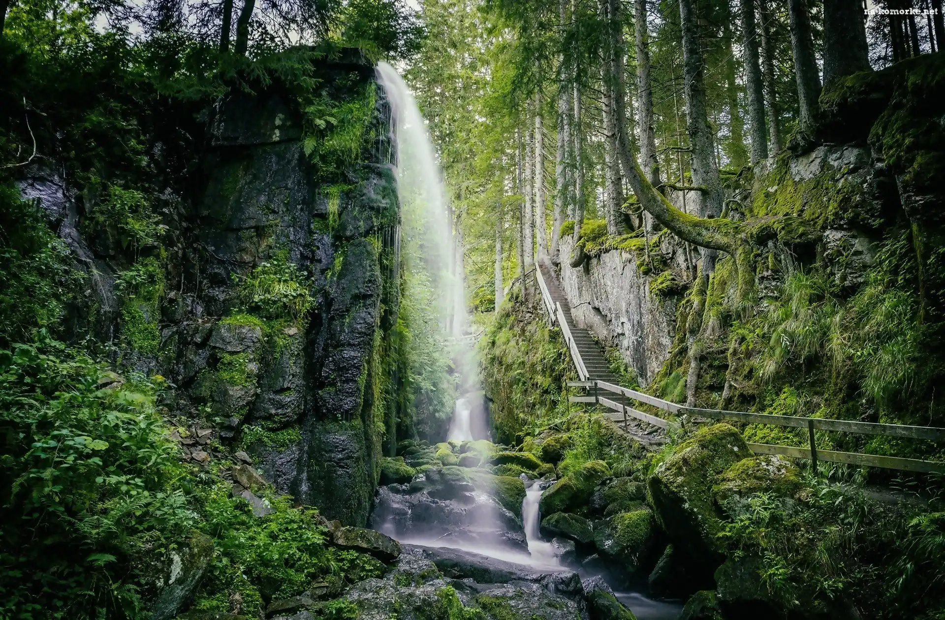 Las, Drzewa, Wodospad, Omszałe na Komórkę