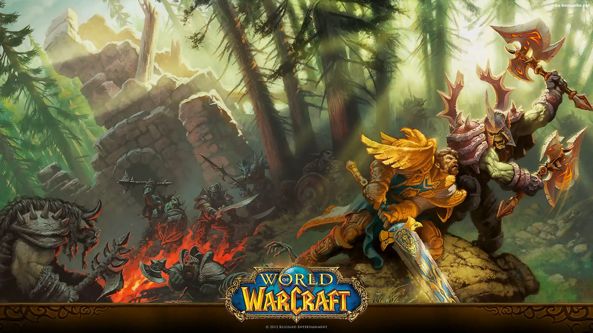 Walka, Ogień, World of Warcraft, Ruiny, Postacie, Gra, Orki, Las, Rycerze, Plakat na Komórkę