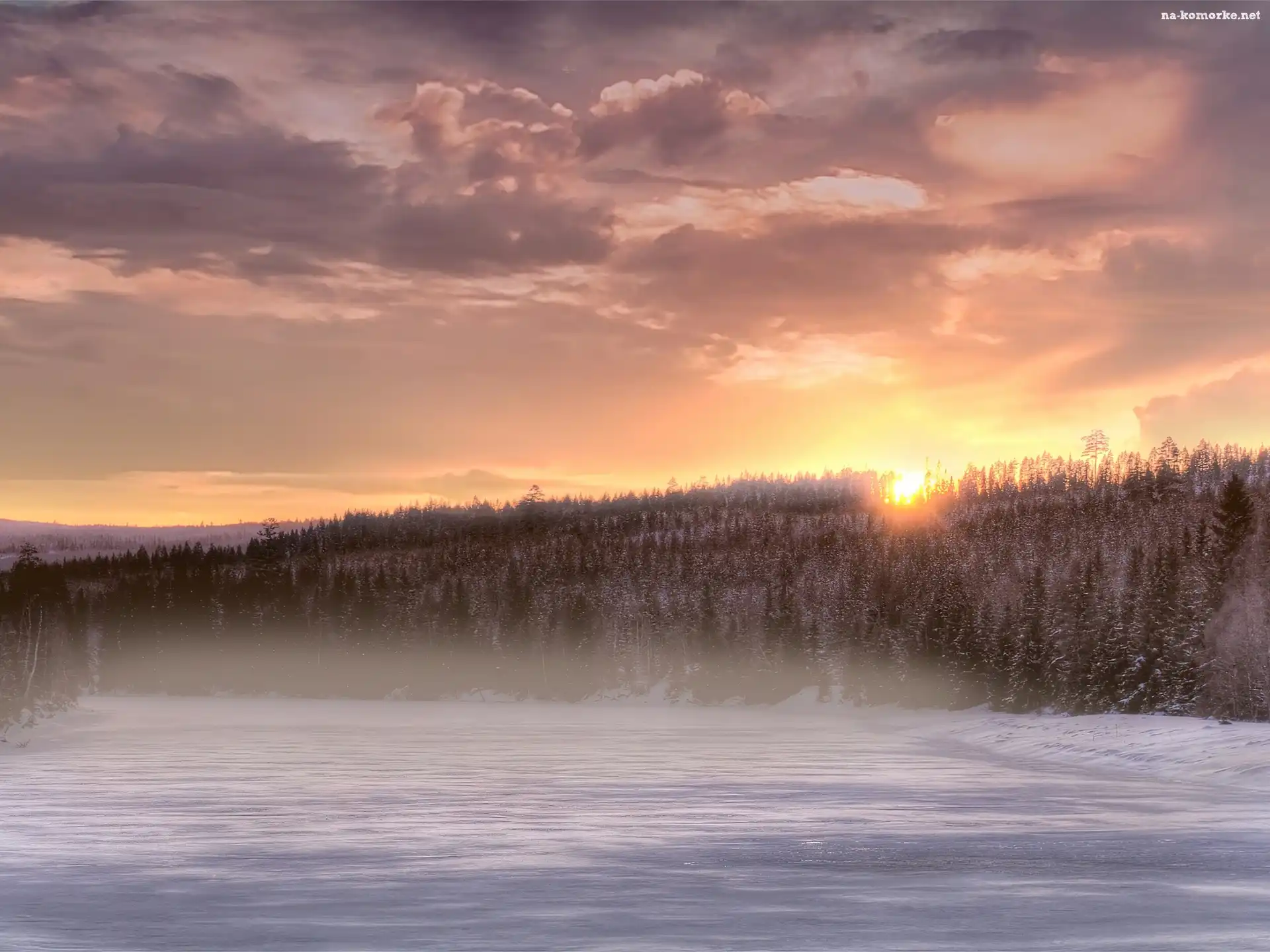Las, Śnieg, Zachód, Słońca na Komórkę