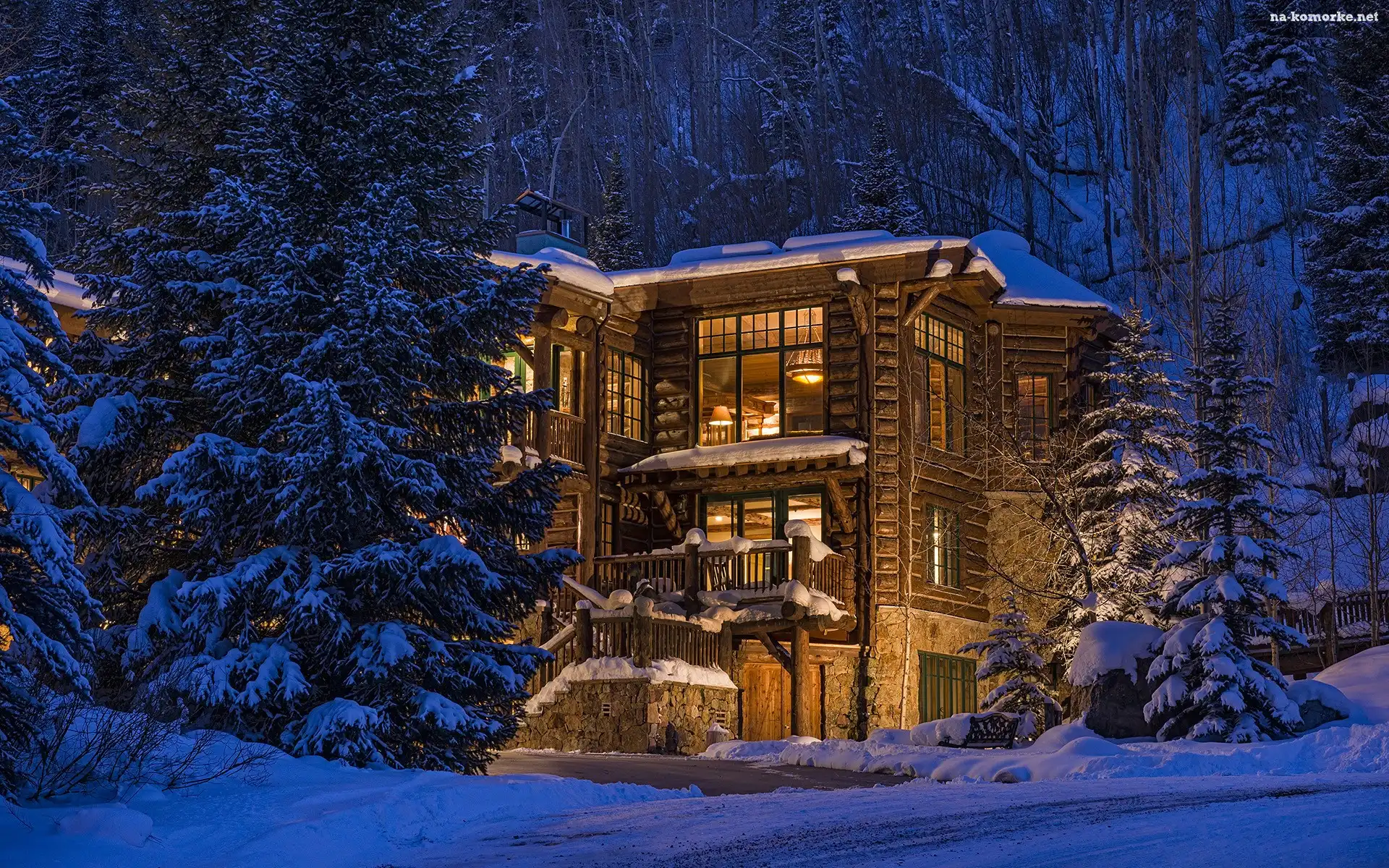Las, Drewniany, Dom, Zima, Noc na Komórkę