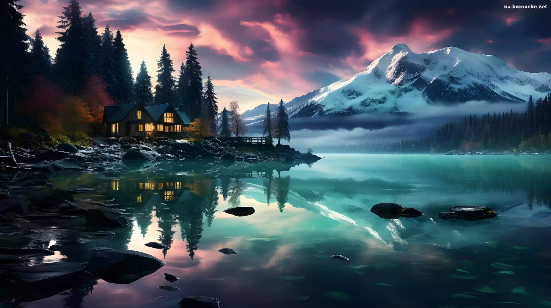 Las, Oświetlony, Odbicie, Kamienie, Jezioro, Góry, Zima, Dom, Drzewa na Komórkę