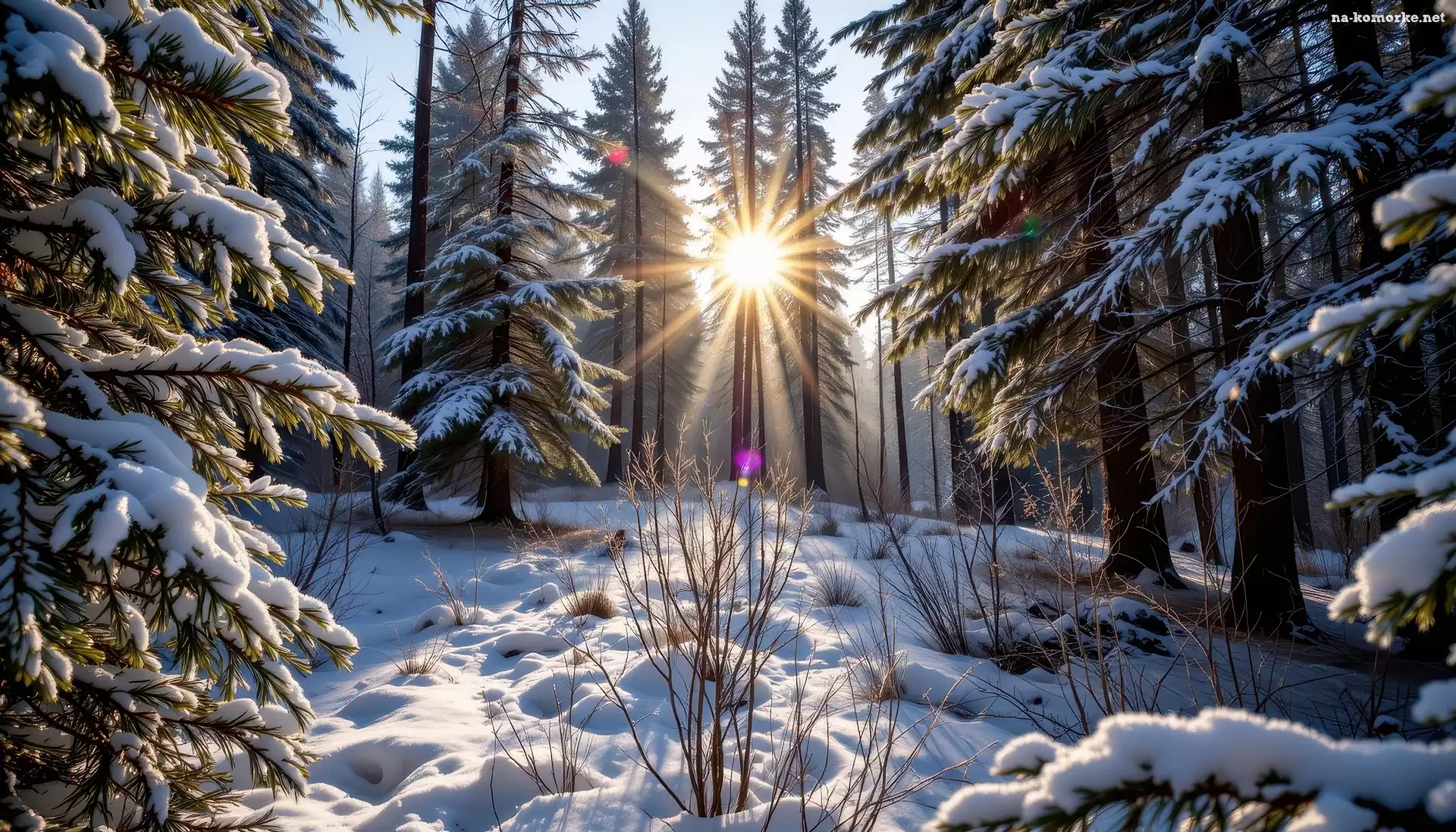 Promienie słońca, Zima, Polana, Grafika AI, Drzewa, Las na Komórkę