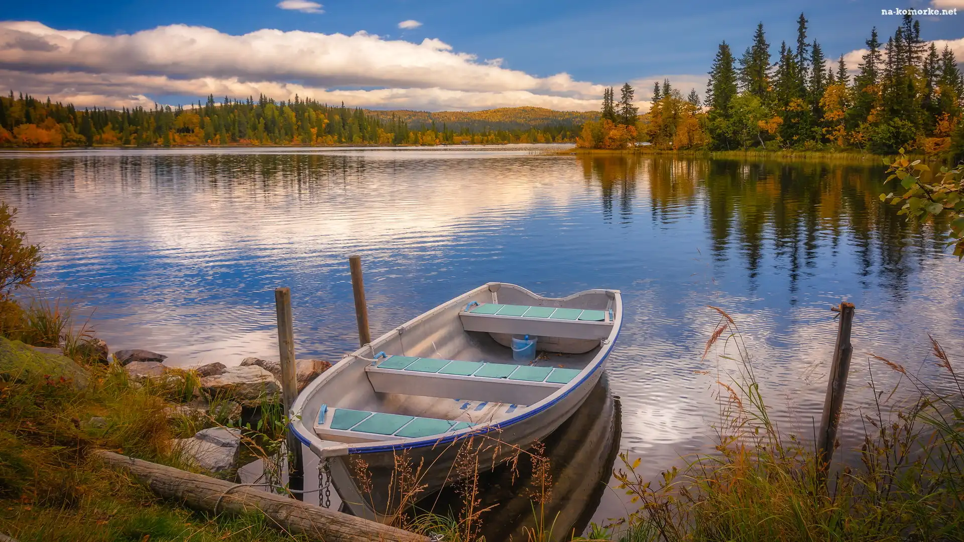 Łódka, Jesień, Jezioro, Lasy, Brzeg na Komórkę