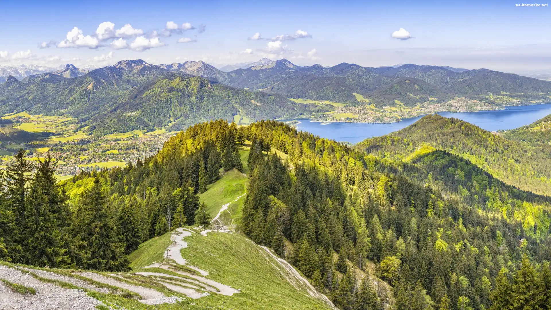 Tegernsee, Niemcy, Dolina, Góry, Jezioro Tegernsee, Bawaria, Drzewa, Alpy, Lasy na Komórkę