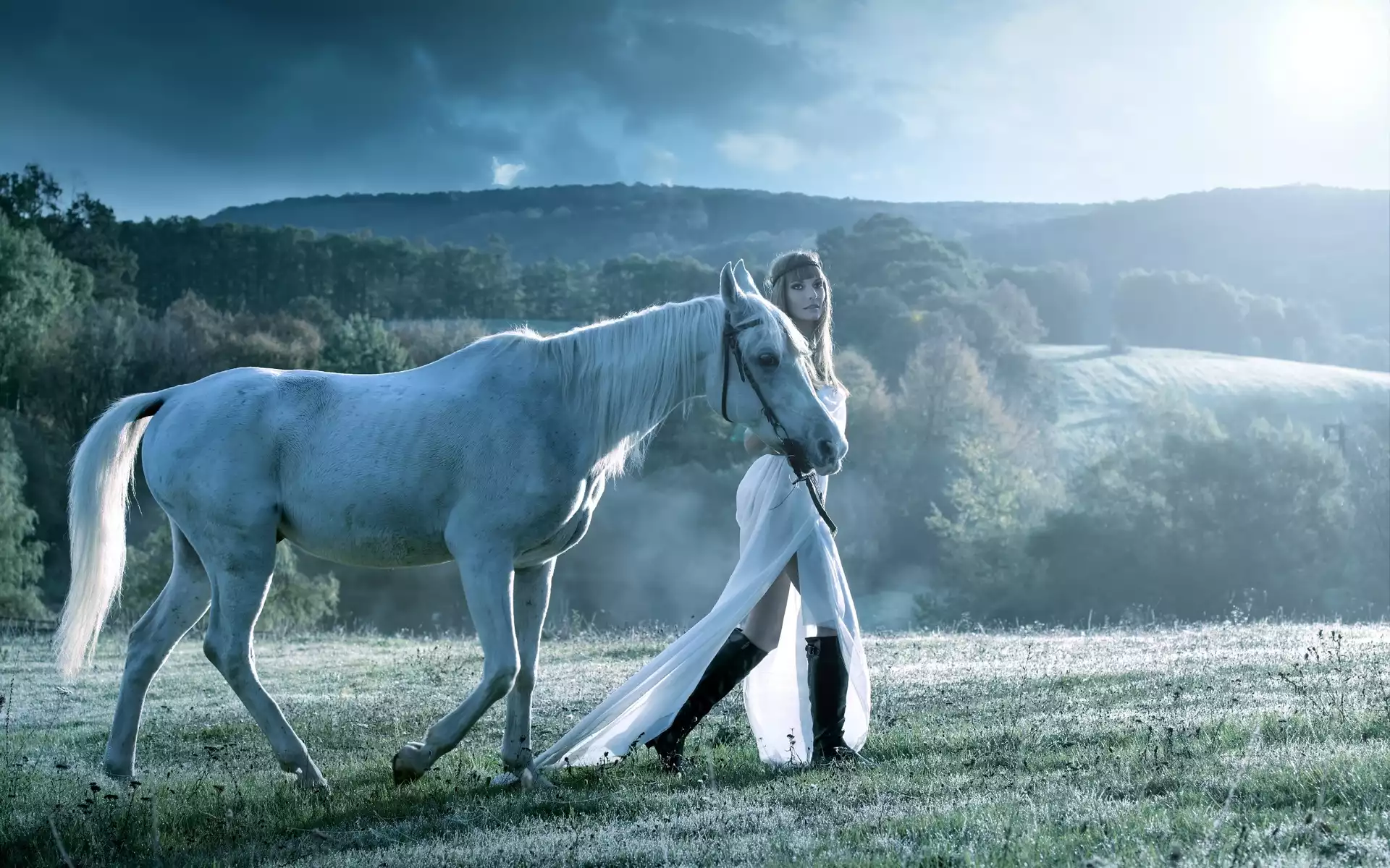 Koń, Lasy, Poranek, Kobieta, Łąka, Mgła, Góry na Komórkę