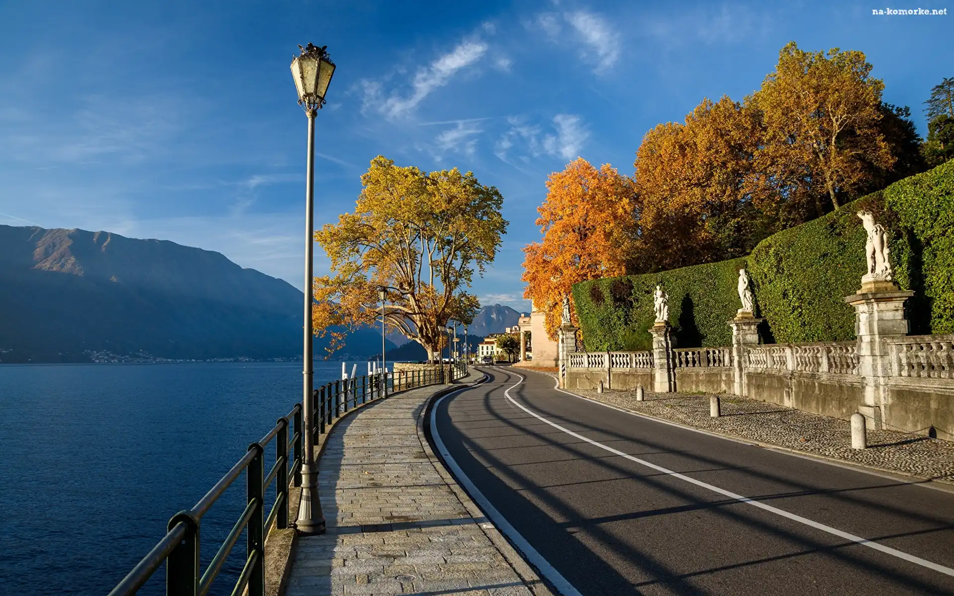 Włochy, Jesień, Drzewa, Jezioro Como, Lago di Como, Droga, Latarnia na Komórkę
