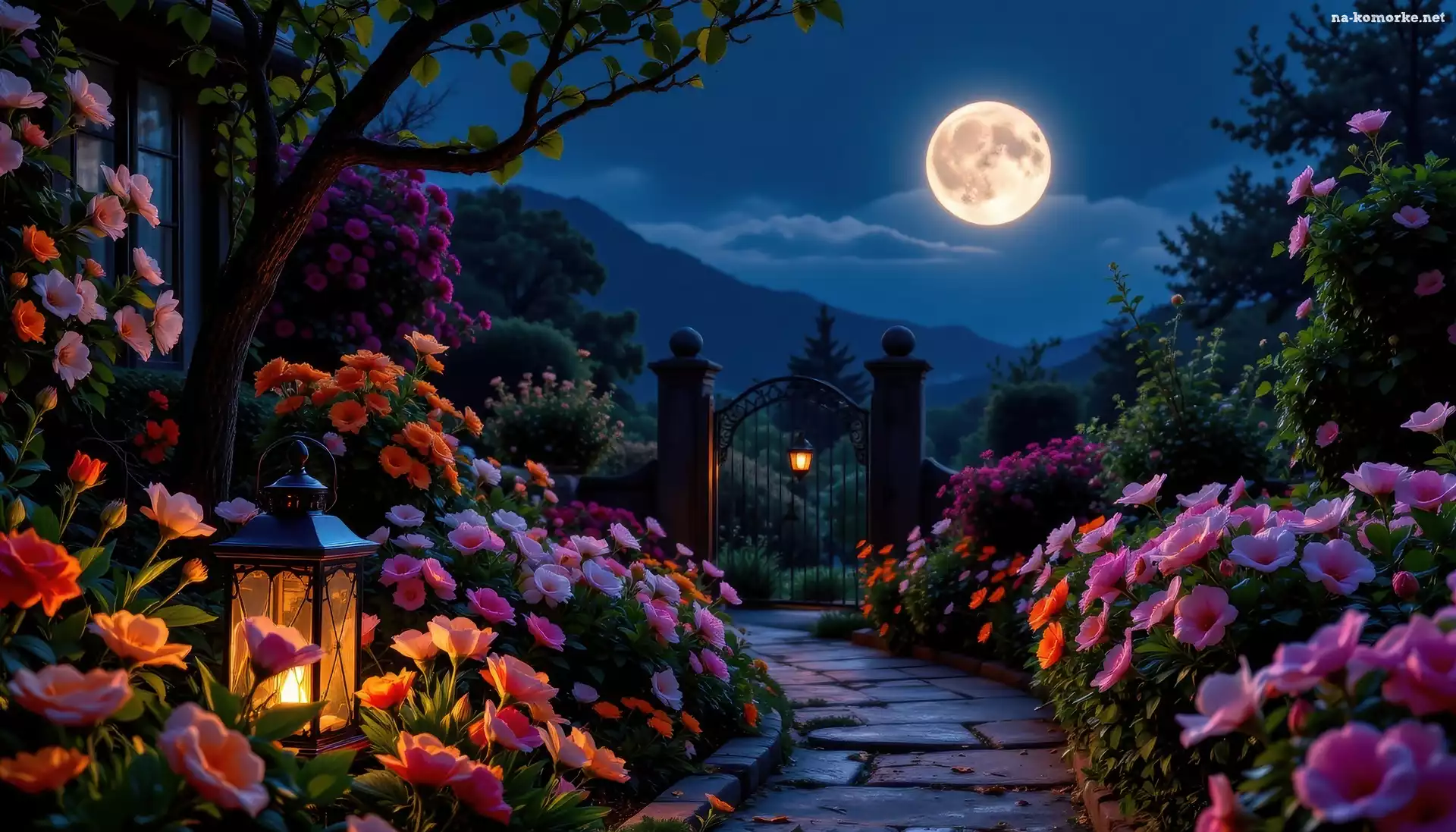 Kwiaty, Księżyc, Furtka, Ogród, Noc, Grafika, Ścieżka, Latarnia na Komórkę