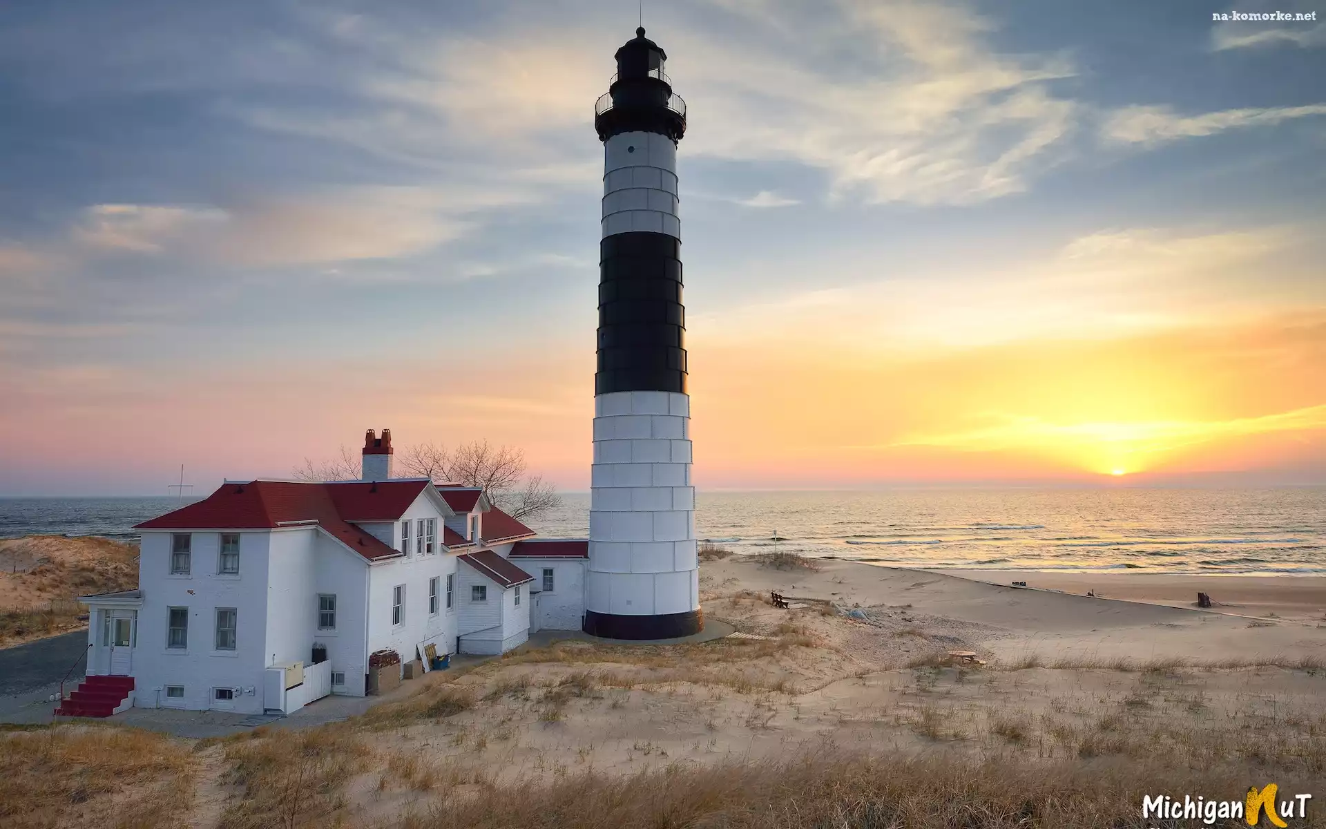 Ludington, Big Sable Point, Michigan Lake, Stany Zjednoczone, Latarnia morska, Zachód słońca, Jezioro, Michigan na Komórkę |