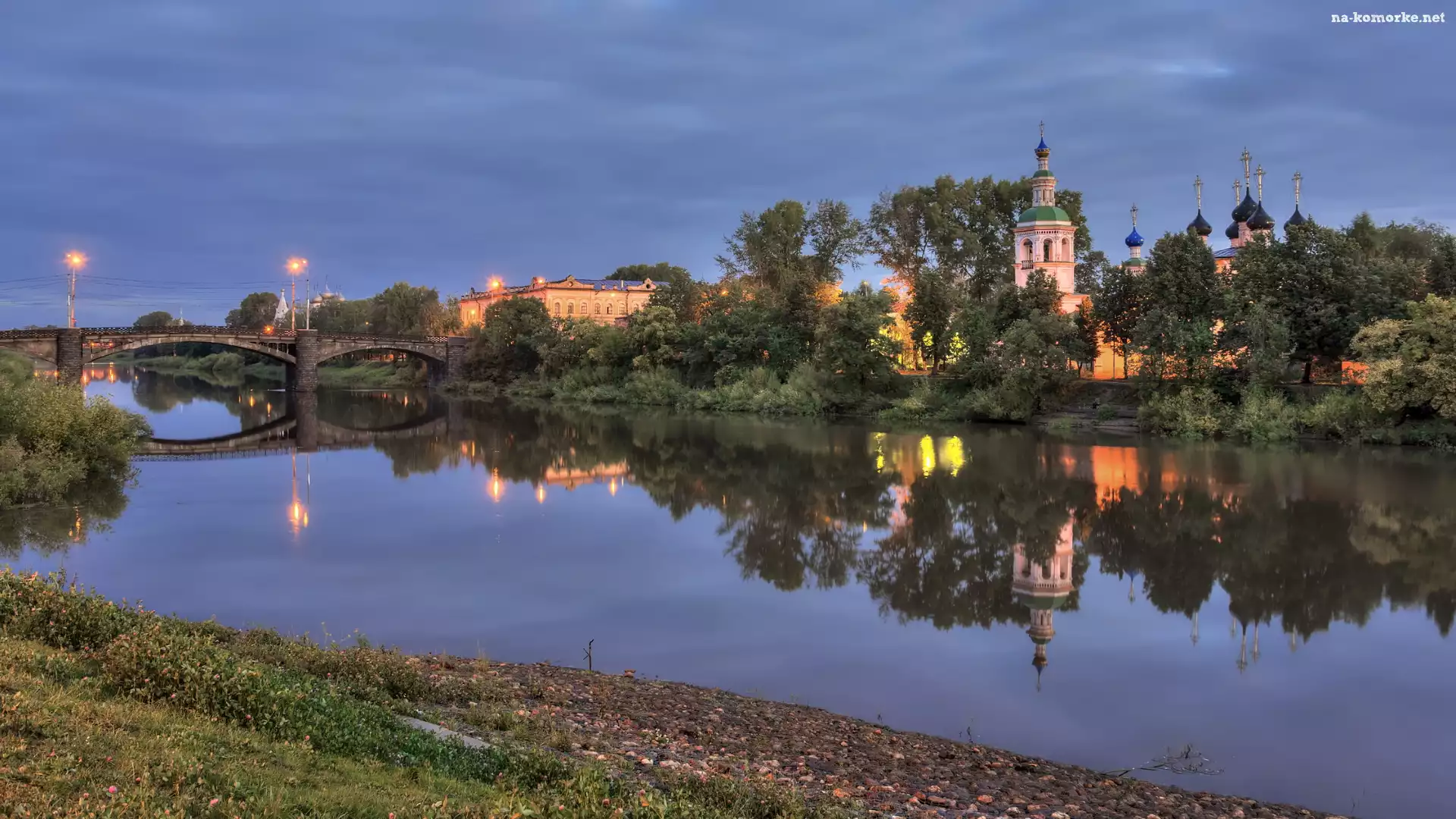 Latarnie, Rzeka Wołogda, Cerkiew Objawienia Pańskiego, Poranek, Rosja, Most, Obwód wołogodzki, Drzewa, Wołogda na Komórkę |