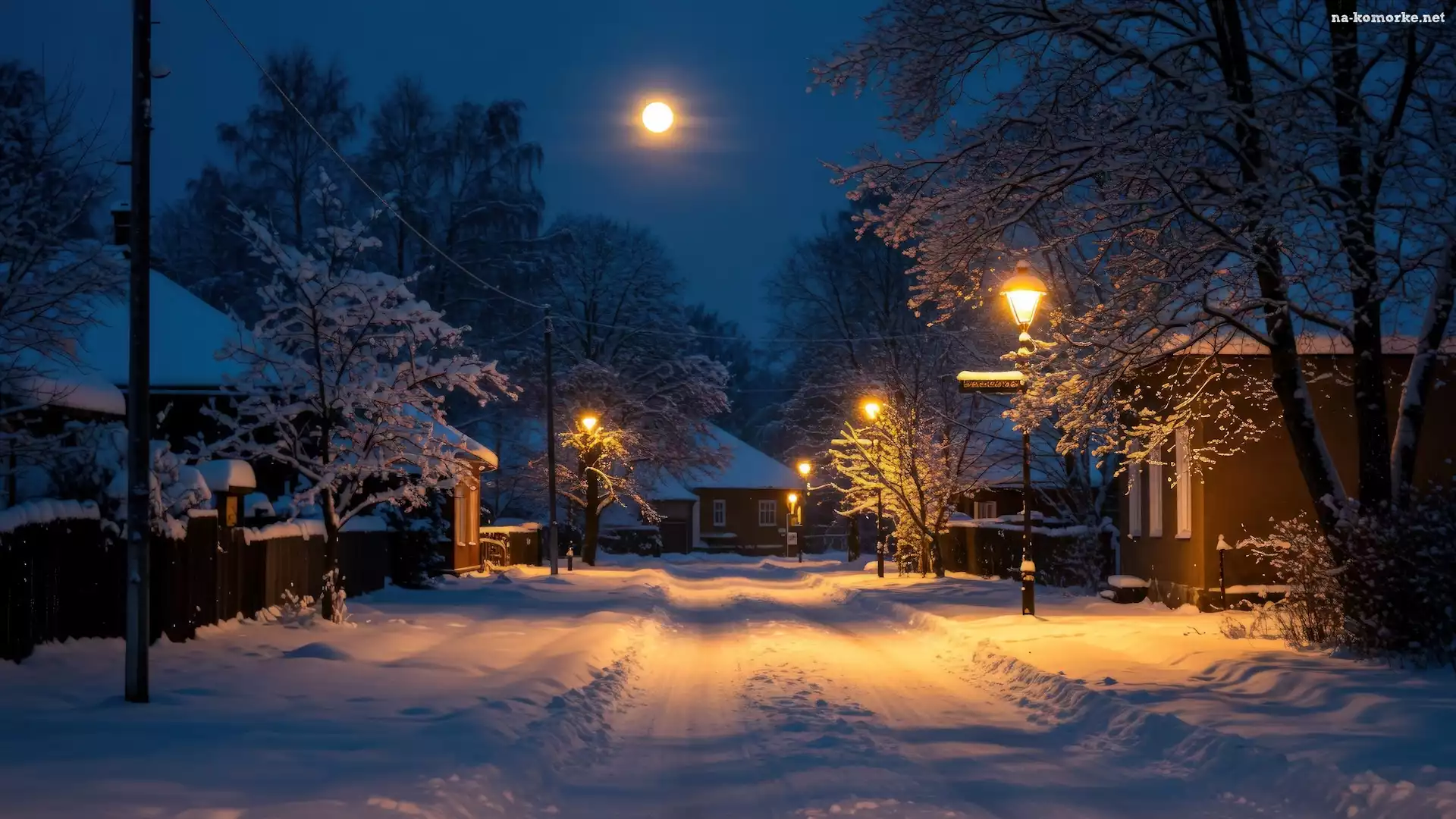 Droga, Zima, Zaśnieżona, Latarnie, Drzewa, Domy na Komórkę