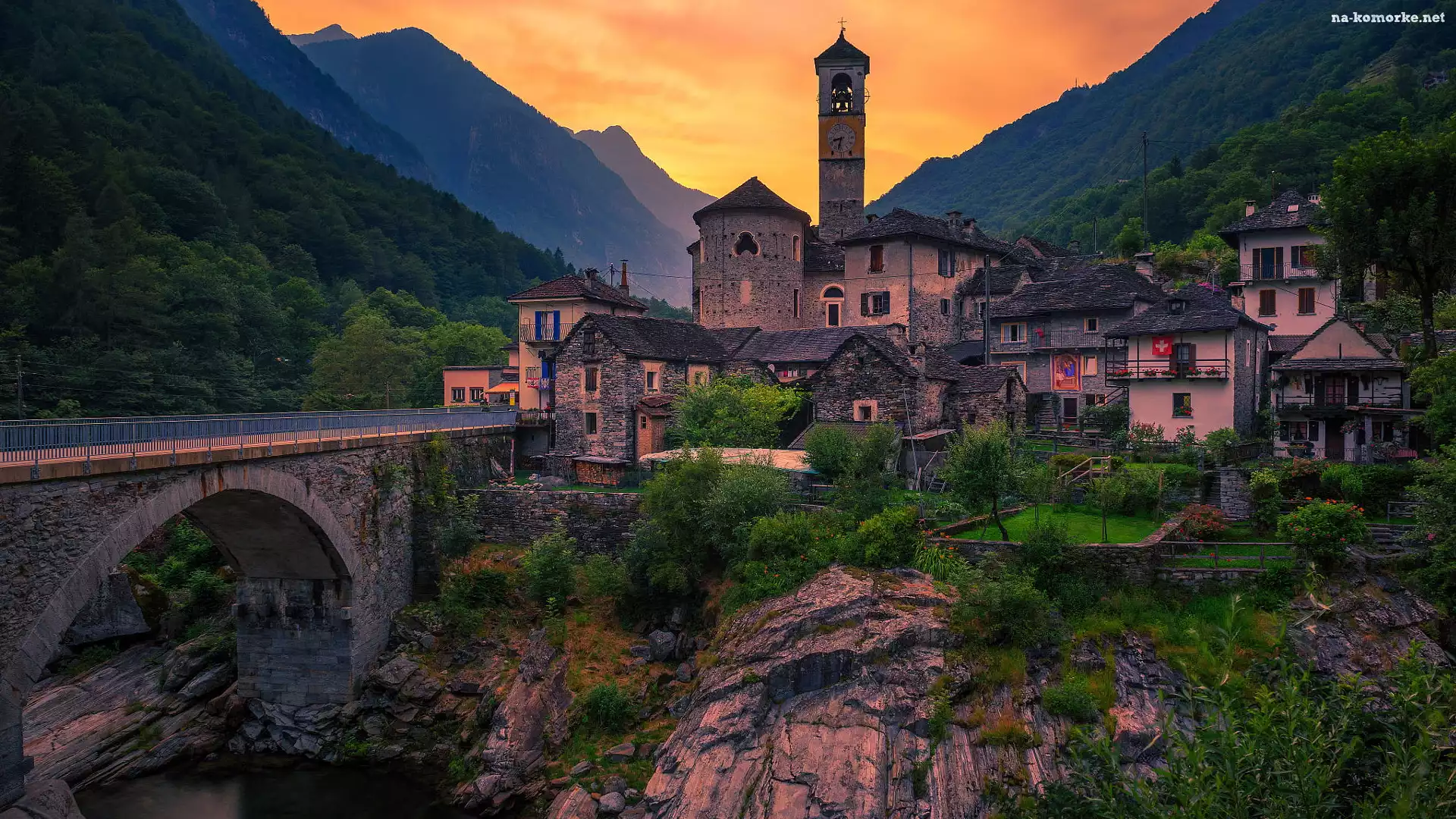 Kościół, Kanton Ticino, Góry, Szwajcaria, Domy, Most, Rzeka, Lavertezzo na Komórkę
