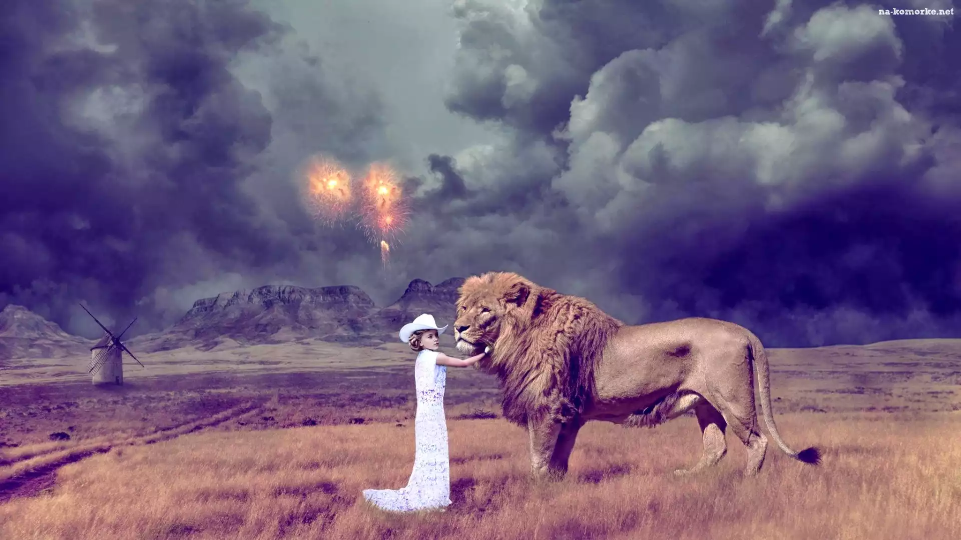Lew, Wiatrak, Kobieta, Chmury na Komórkę