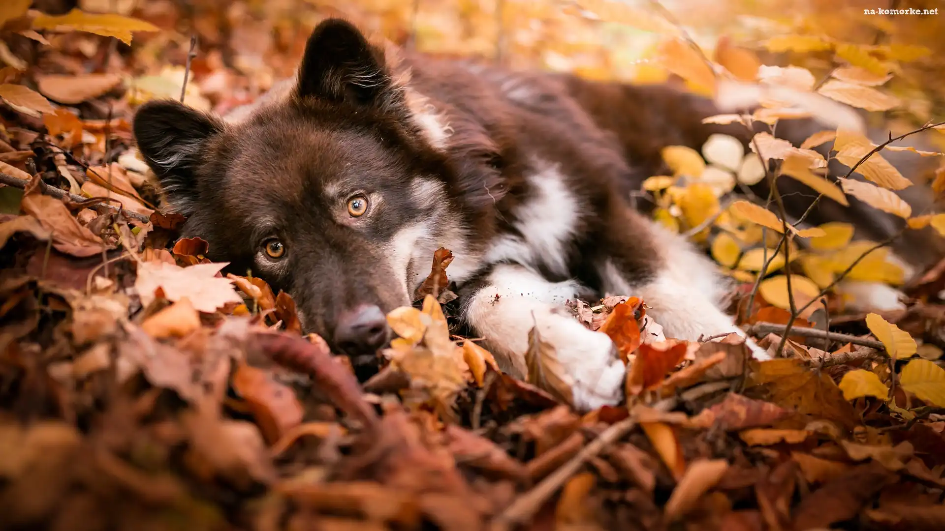 Leżący, Liście, Pies, Mordka na Komórkę