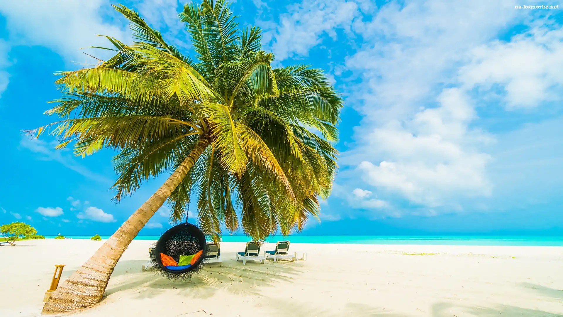 Leżaki, Plaża, Morze, Wakacje, Palma, Chmury na Komórkę