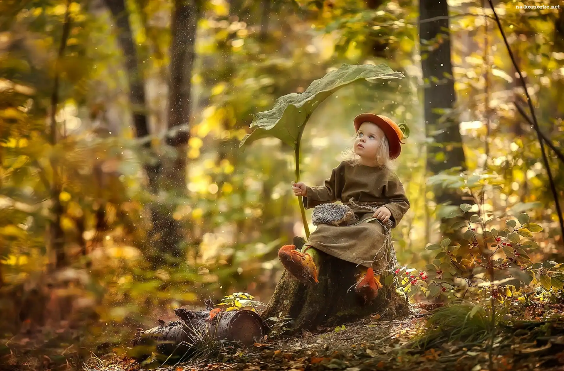 Liść, Krasnoludek, Dziewczynka, Las, Jeż, Drzewa na Komórkę